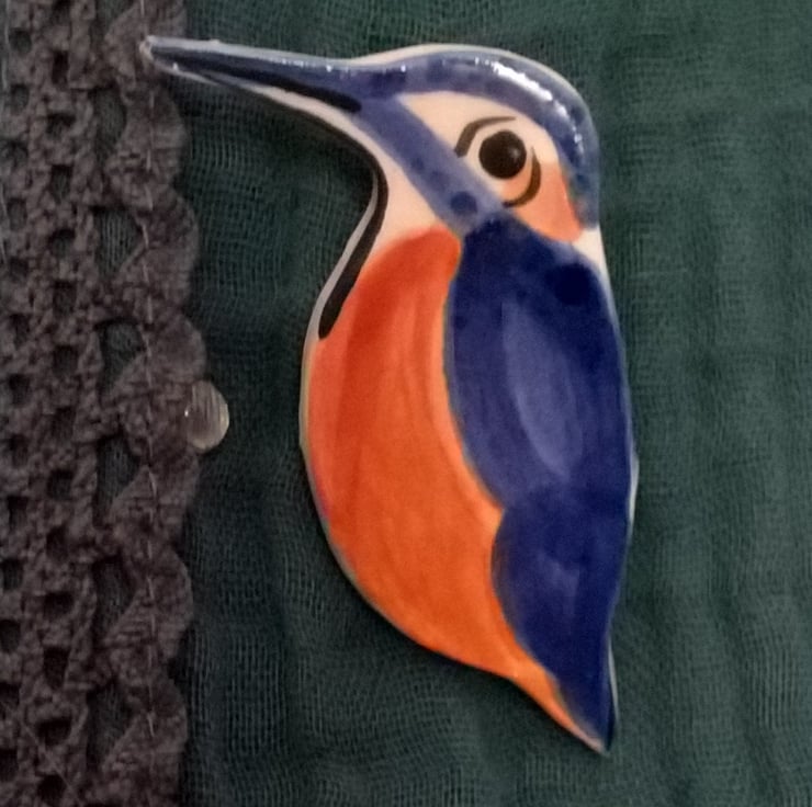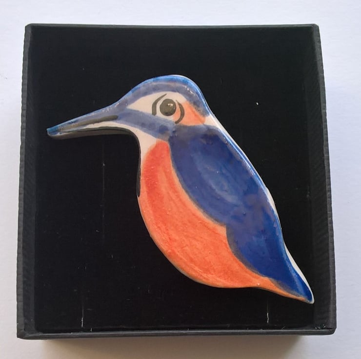 This is a lovely ceramic kingfisher brooch, which comes in a Black Jewellery box for safe keeping, it makes a lovely gift for anyone who is mad on birds. The brooch shows the glorious colours of a kingfisher, with it's speckled head and elegant beak.