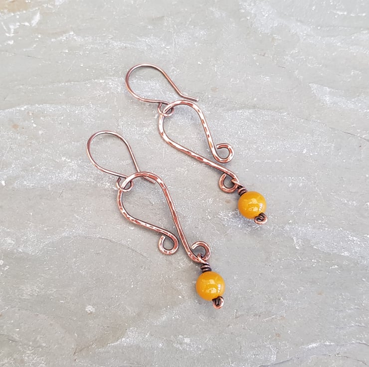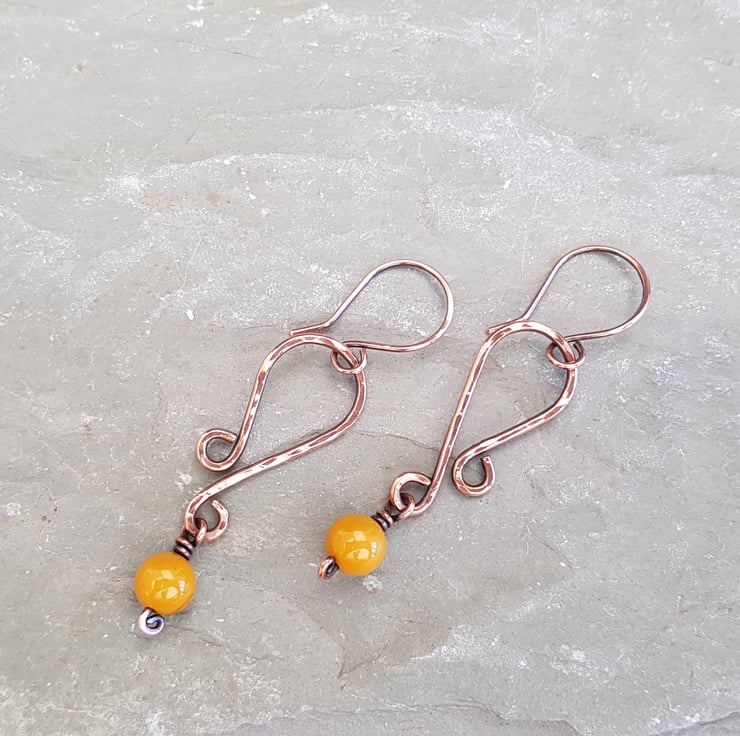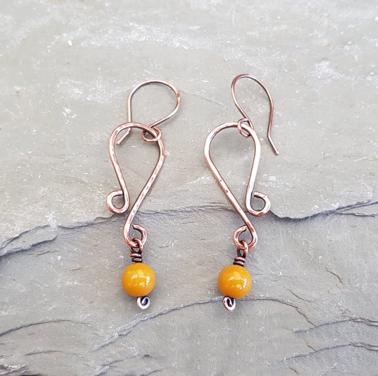 Wire wrapped dangle earrings I have handmade using solid copper wire with these lovely 6 mm mookaite jasper beads at the bottom. They hang from handmade copper ear wires and I added a patina to age the copper then hand polished them to a lovely antique copper finish.