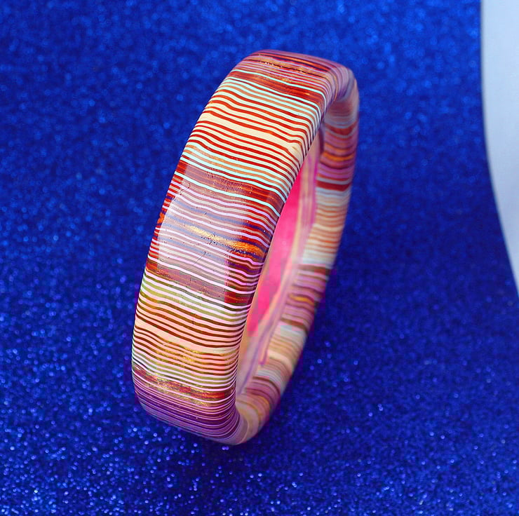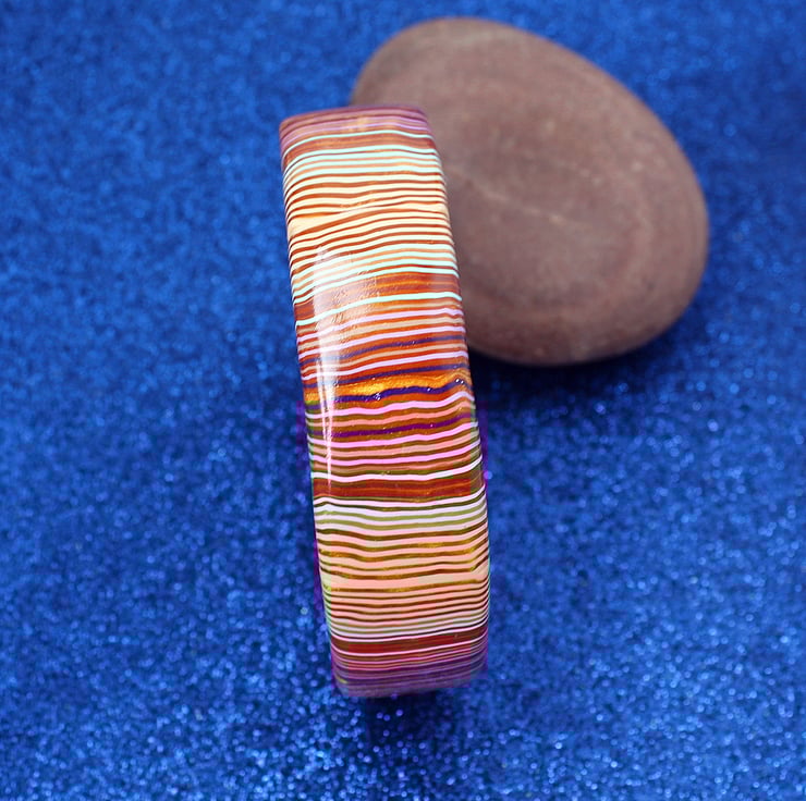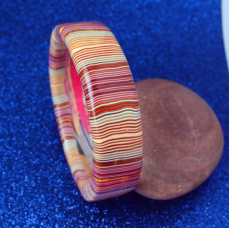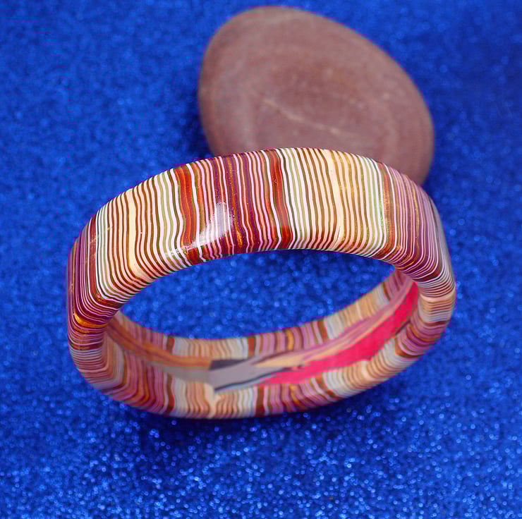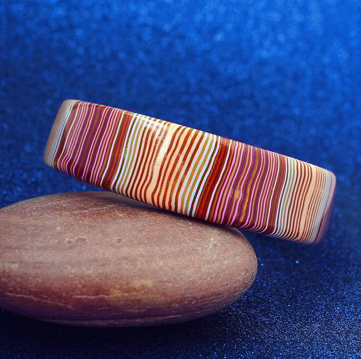 This is a unique piece - very original - made by myself and ready to go. It is crafted entirely from polymer clay - excellent lightweight and hard-wearing stuff that will keep those lush tones forever. The bangle has been shined and polished to a high degree.