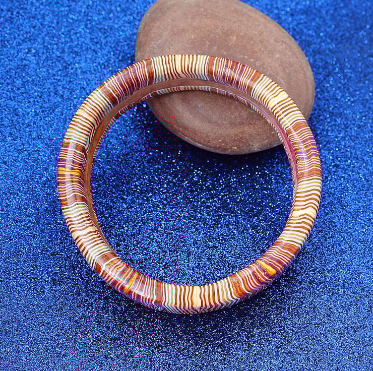 Hand crafted, fine and delicate stripey pattern work make this unusual and noticeable bangle. A lovely combination of crimsons, golds and sky-blue colors.