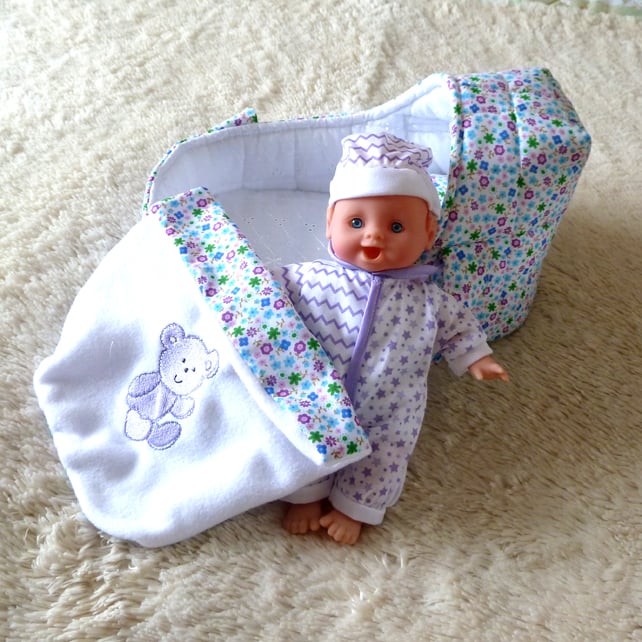 This pretty small doll's carrycot is made from polyester cotton which has a ditsy daisy design.