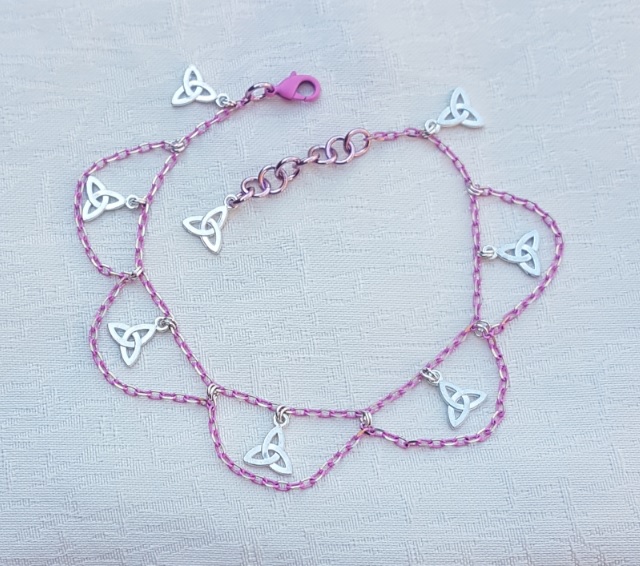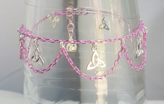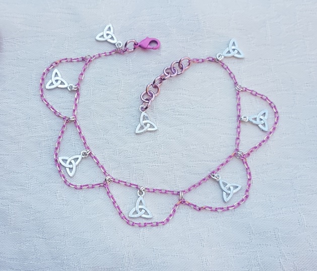 Gorgeous Pink Chain Anklet with Triquetra or Trinity Knot Charms. A beautiful piece of jewellery for the Summer. The pink chain is actually two-tone pink and gold, but this is very subtle. Fab Triquetra charms and draped pink chains dangle from it. An unusual piece of handmade jewellery.
