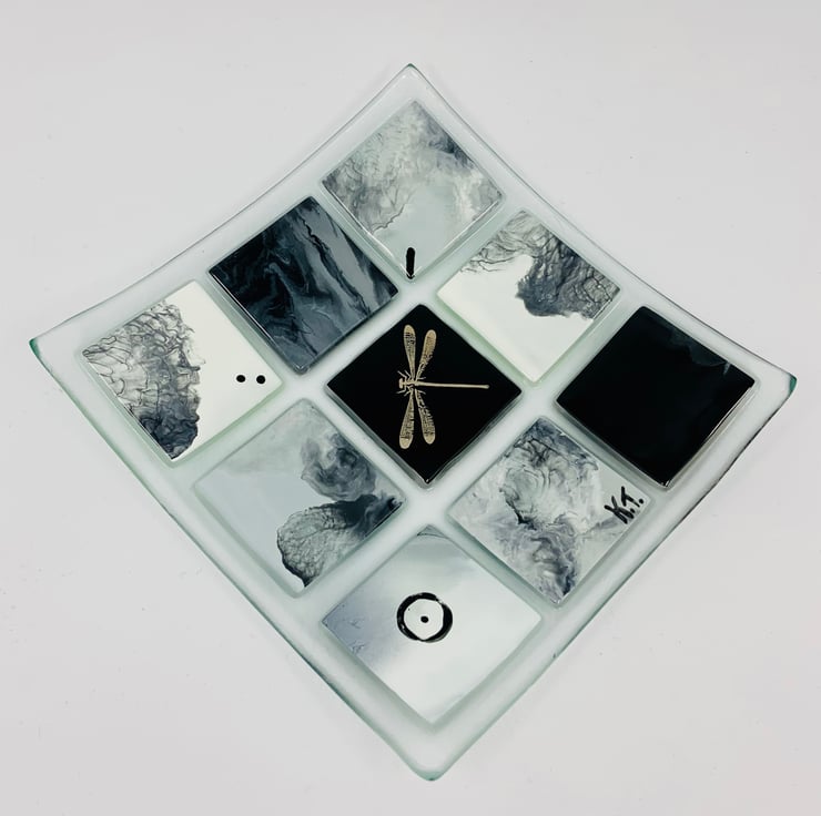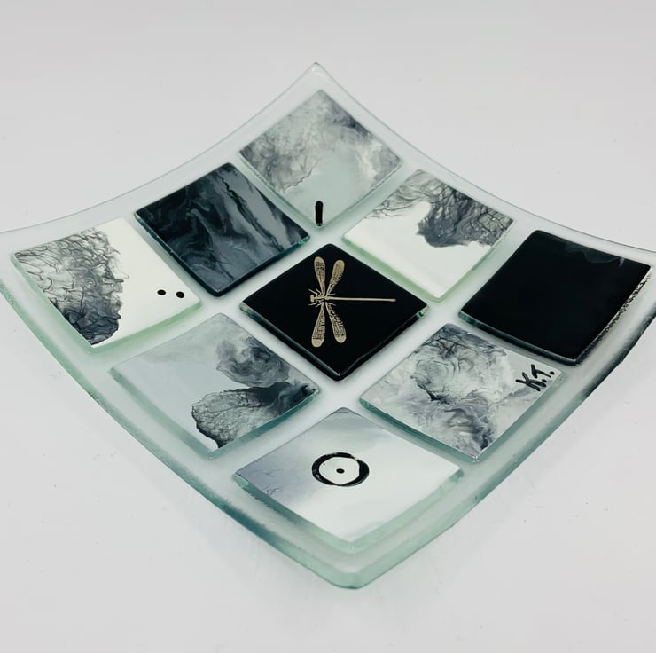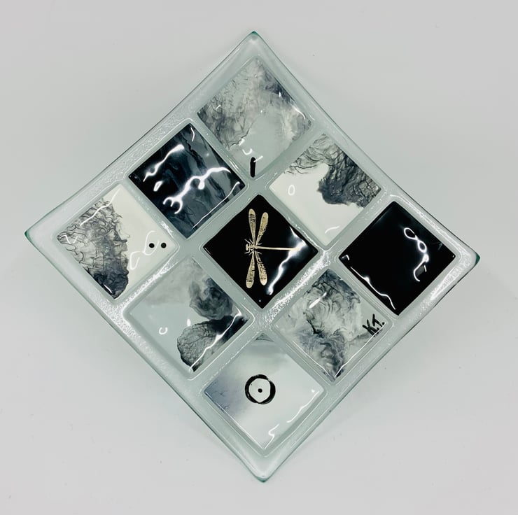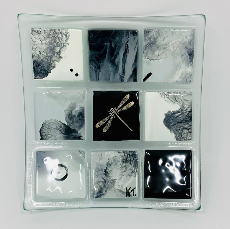 Beautiful Monochrome Fused Glass dish with dragonfly.