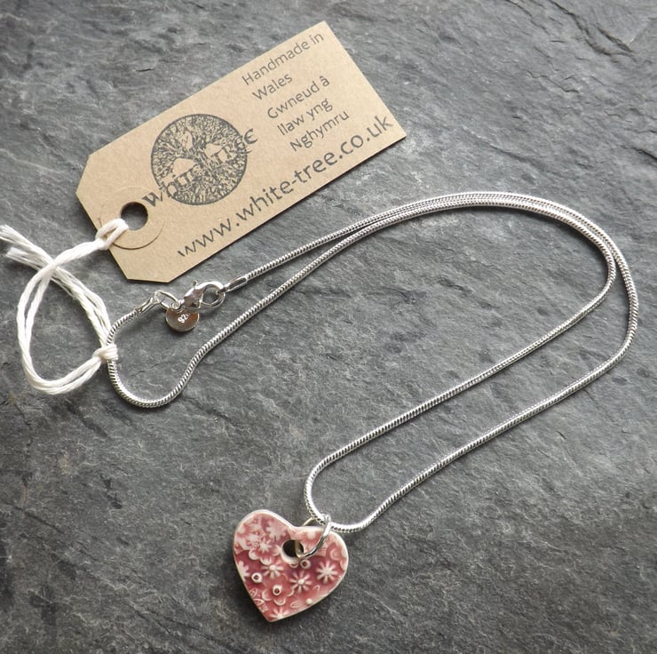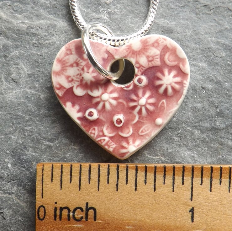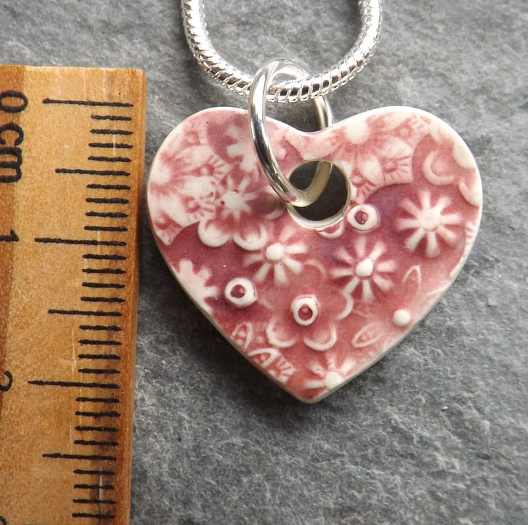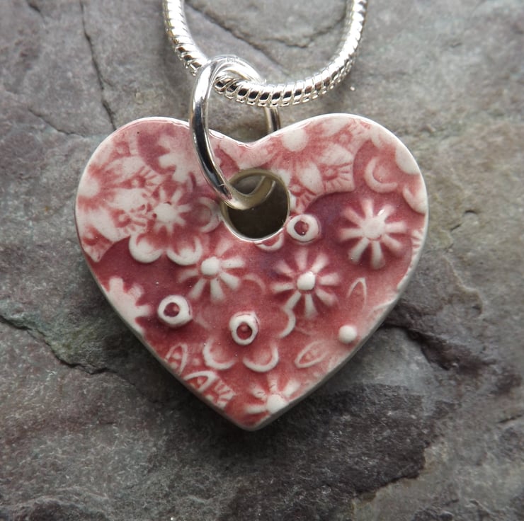 This pretty little heart shaped pendant has washes of rose pink across a textured floral pattern.