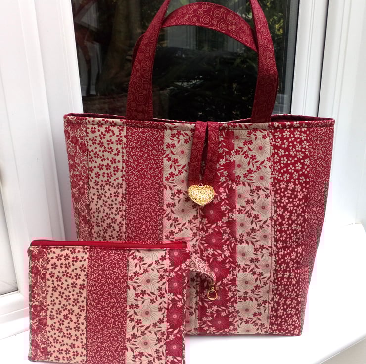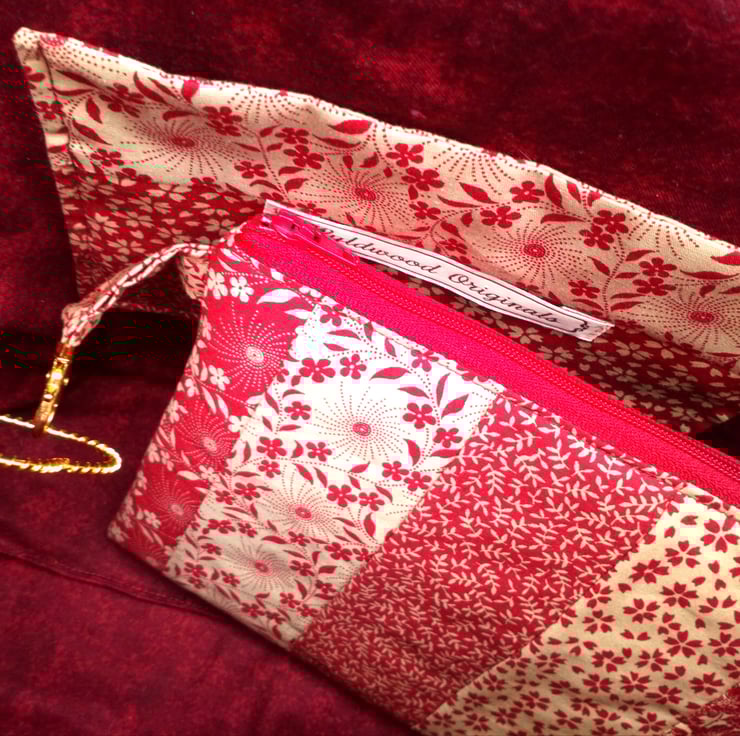 A rhapsody in red this lovely handbag created with panels of red floral fabric and dark red lining has a small make up bag which is clipped to a gold heart on the inside.