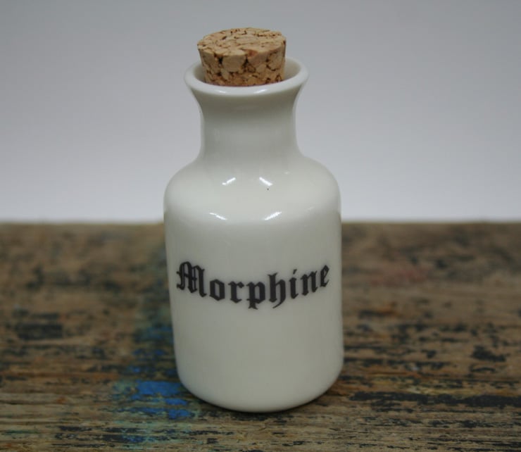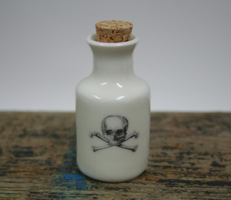 An individually hand thrown small porcelain bottle with morphine wording and skull and bones image on the reverse. The bottle is empty. It includes a cork. Approximate size 7.5cm high and 3.5cm diameter at the base. Please note sizes may vary slightly due to the handmade nature. Because the transfers are fired on at 800 degrees centigrade they are permanent and the bottle can be used.