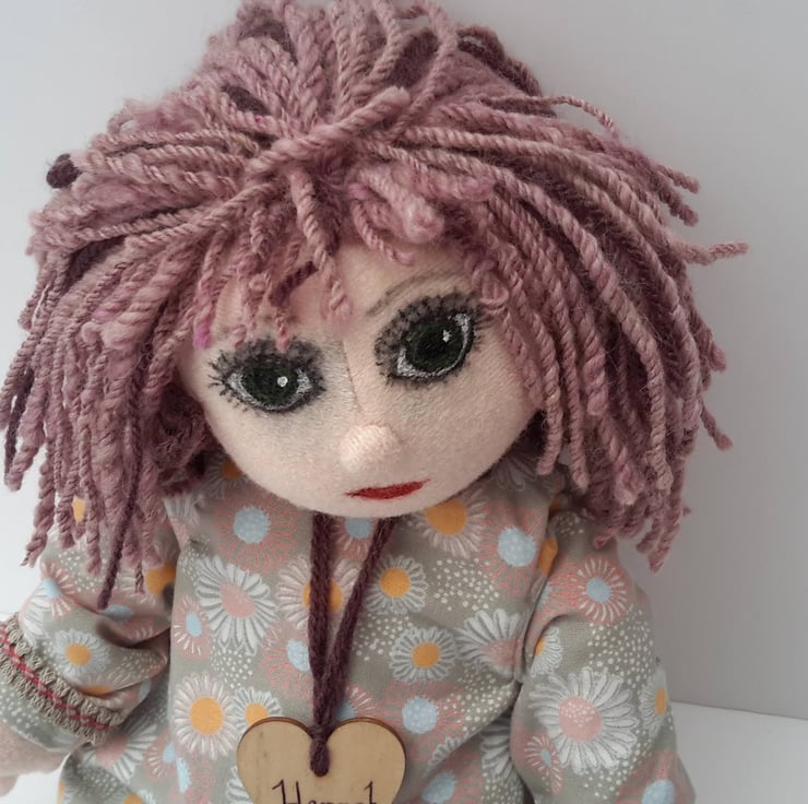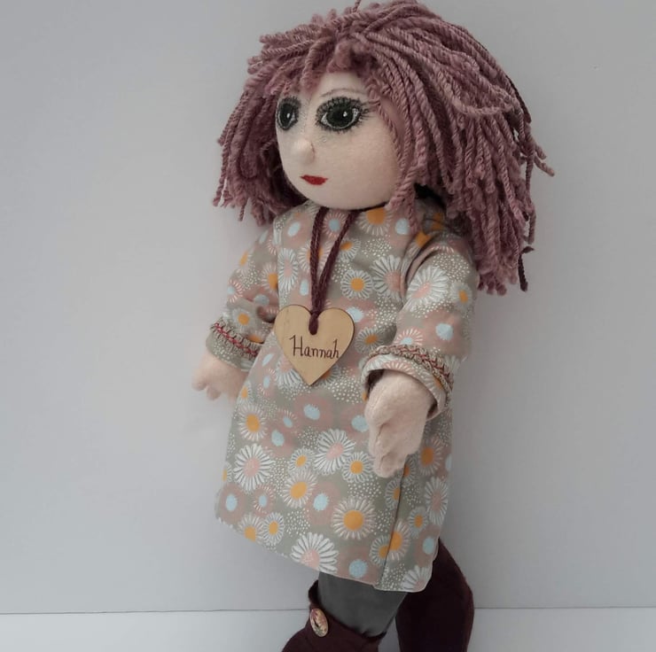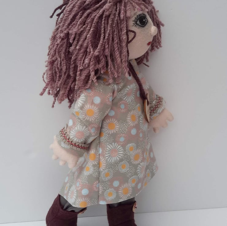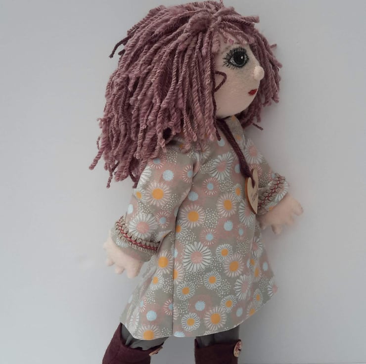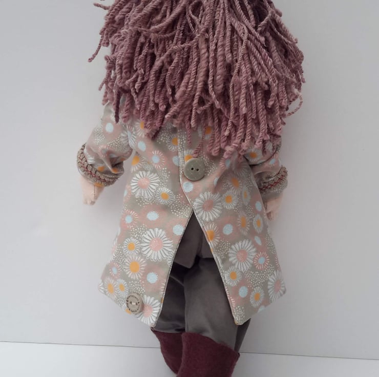 Her hair took many hours to complete, each strand has been individually strung onto a coiled wig cap which I made from plum yarn. The hair has been made from beautiful Yorkshire spun and hand dyed wool yarn in mauve with a few streaks of deep plum added.