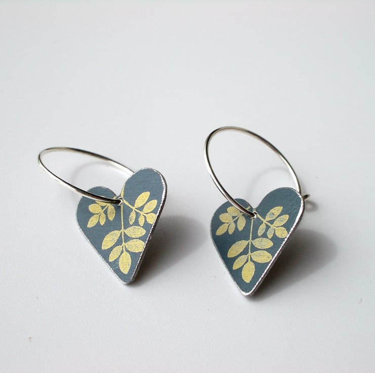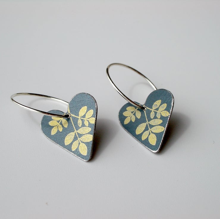 These cute little heart earrings are made from aluminium which I have dyed a dark charcoal and printed with a gold leaf design. The dye is made permanent through heat and the colour becomes part of the metal. I cut out the heart shapes by hand using a jewellers saw and file the edges to give a nice finish. Finally I have hung them on 15mm sterling silver hoops. The hearts measure approximately 12mm x 12mm.