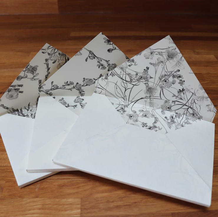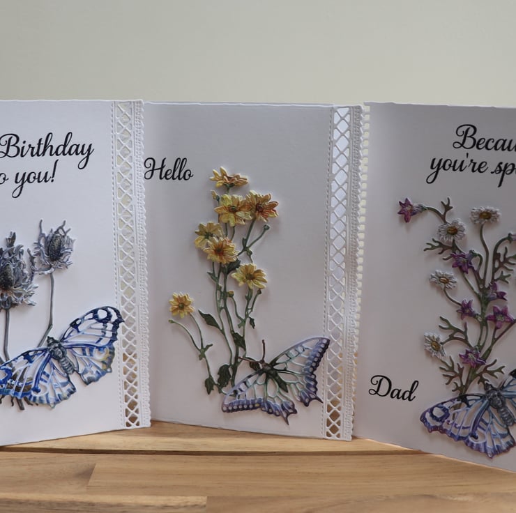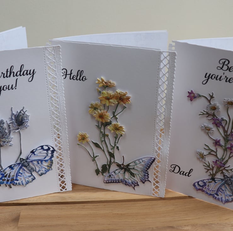 These cards are for all occasions, each card is 7 x 5 approx and is a set of three and are lined with a faded flower design for your special message, they come with hand made envelopes with a plant or flower design inside.
