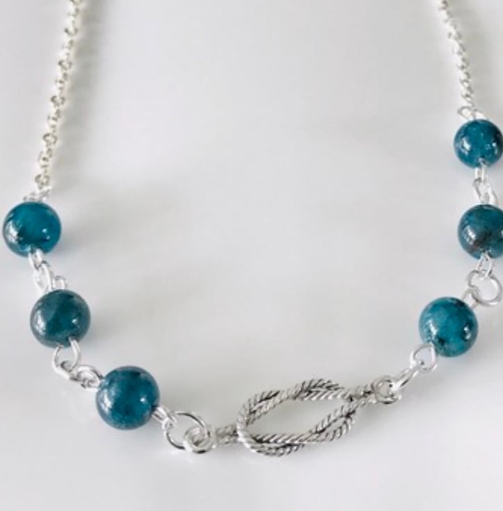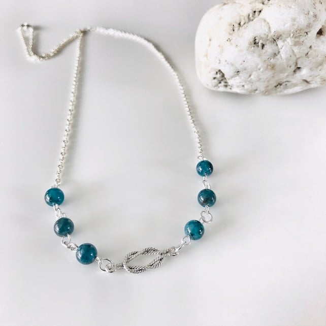 A stunning necklace made with ocean blue 6mm Apatite semi precious round beads, completed with a sterling silver twisted rope effect connector (which measures 21x7mm).