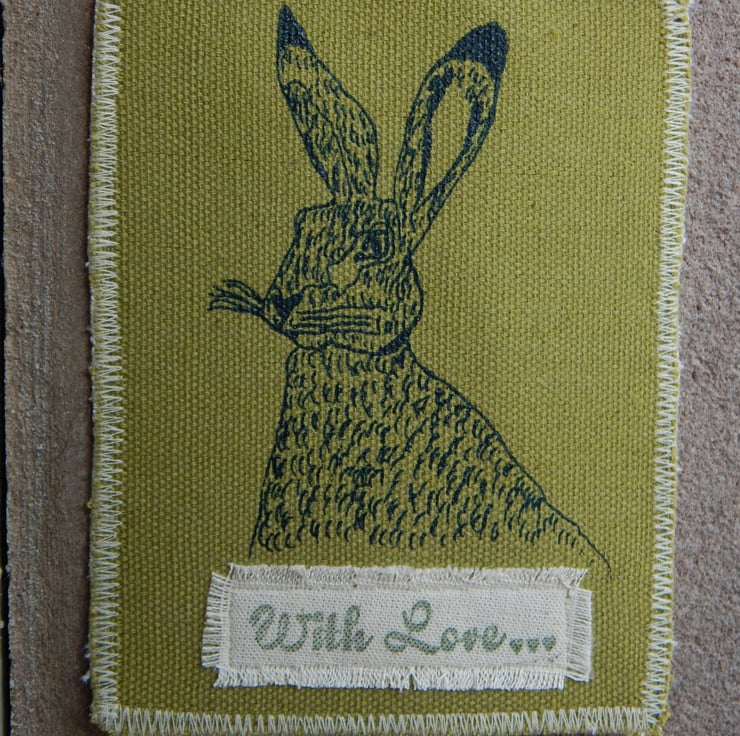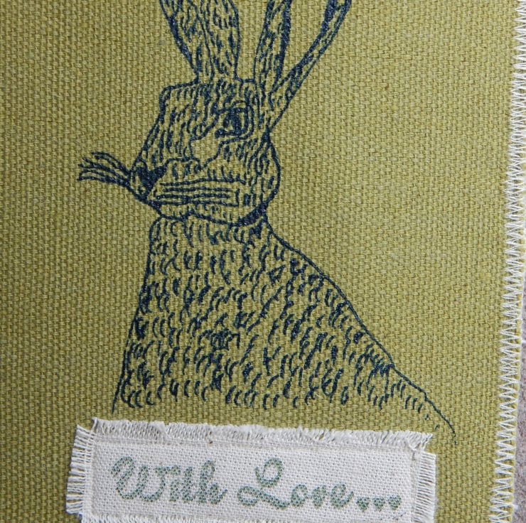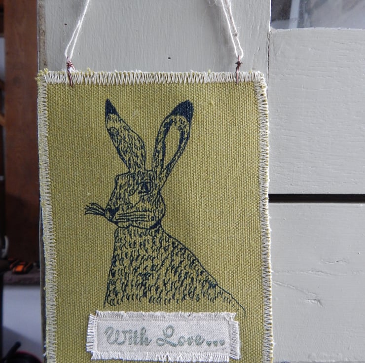 This is a hanger that I have screen printed a hare onto. I have appliqued With Love onto the front of the hanger. I have then attached 2 simple metal fixings on top to pop some nettle string to for hanging. The edging has a zig-zag stitching to prevent fraying.