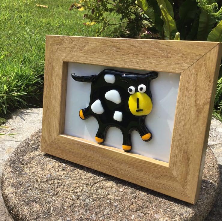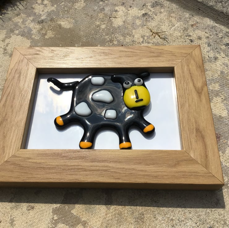 Fused glass freesias cow in a wood frame 6 in x8 in . Perfect for the fun and quirky in your life