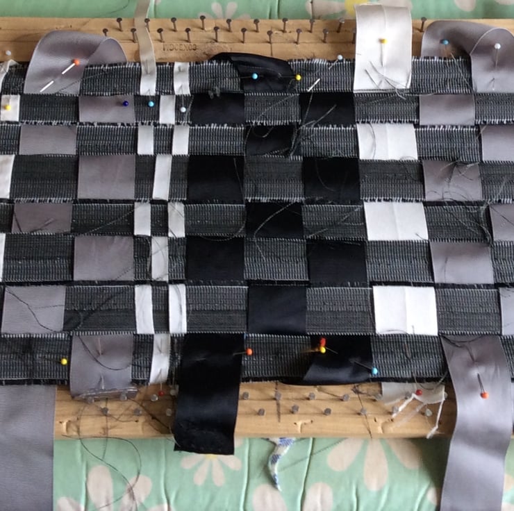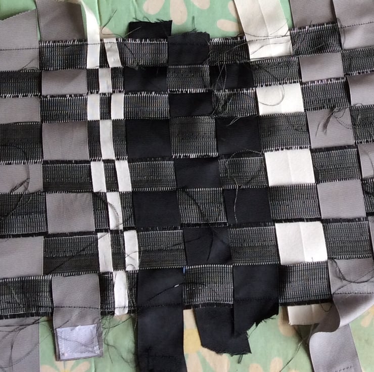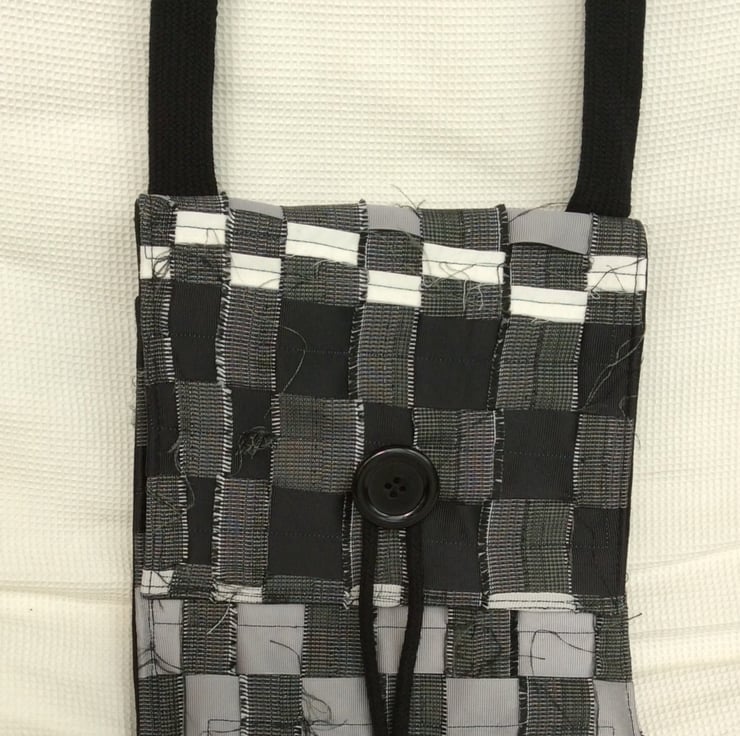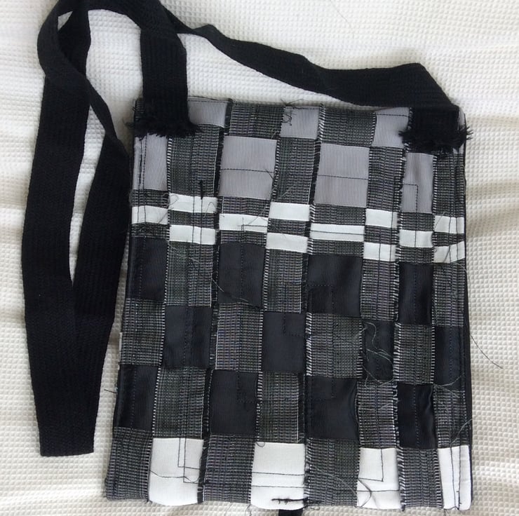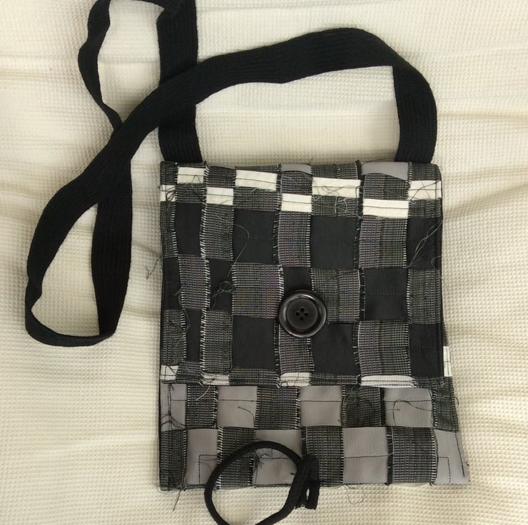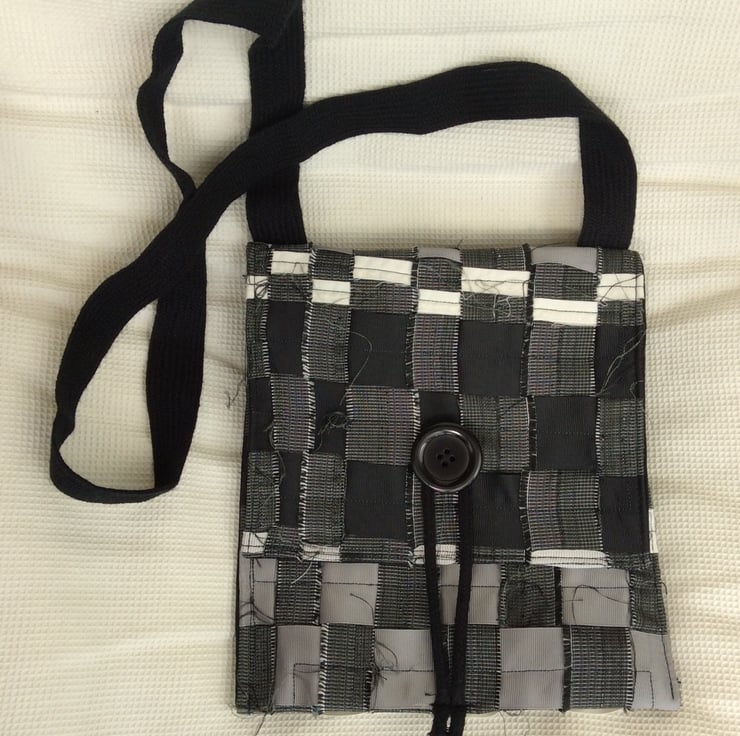 This unique shoulder bag/satchel with a fold over, front flap is made from a handmade woven fabric. Raw edged (so expect loose threads), recycled, mixed fabric strips in monochromatic shades have been woven together and then machine stitched to felt for structure. The bag is lined with black cotton twill fabric and has an inner slip pocket. The bag measures approximately 24cm x 22cm when closed and has a black oversized button and soft black cord loop closure. The strap is made from a soft webbing and measures approximately 97cm.