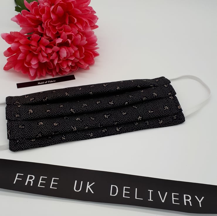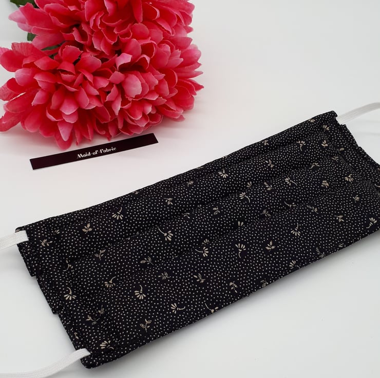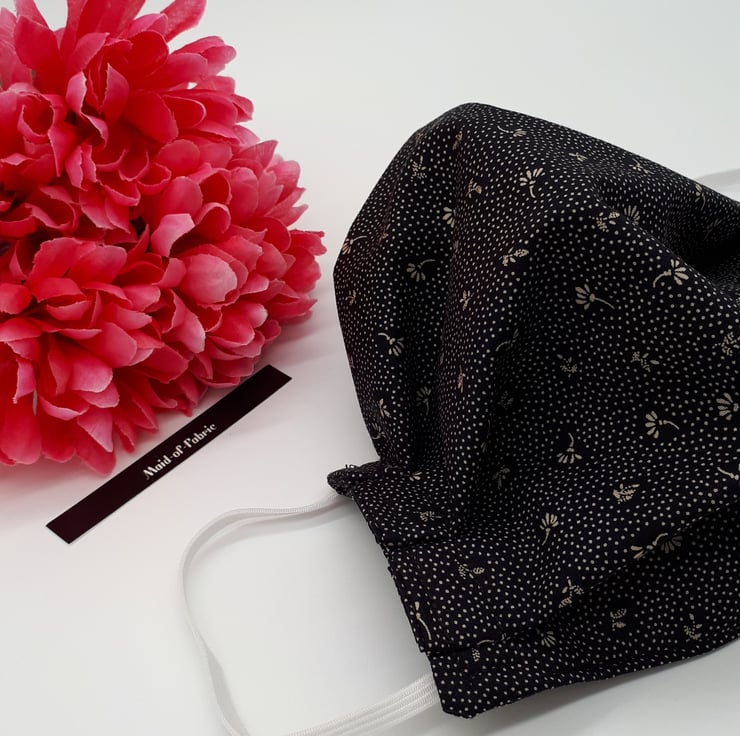 Face mask made using a black flower and dot beige patterened cotton fabric and white elastic.