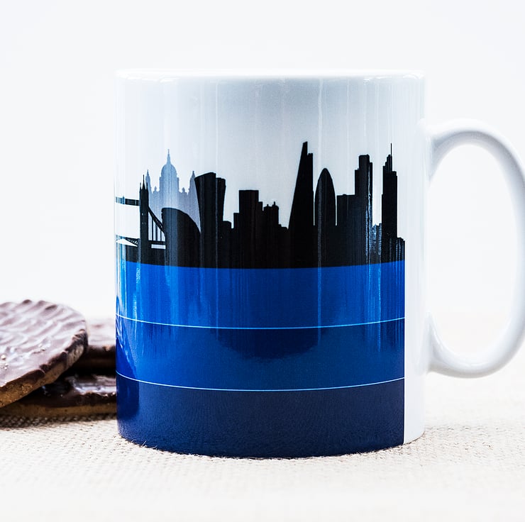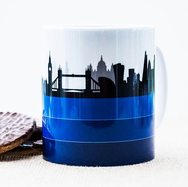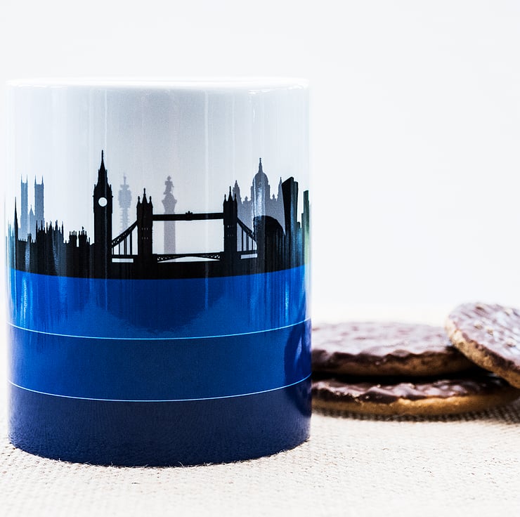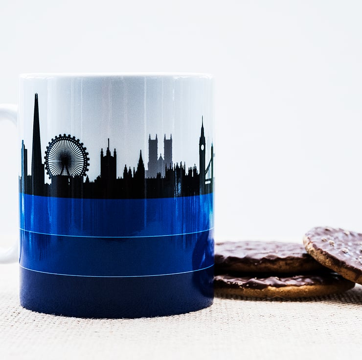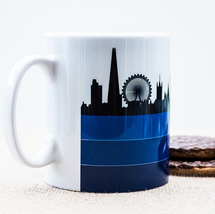 A beautiful ceramic coffee mug that is sure to delight any Londoner! It has a silhouette motif showing a skyline of different iconic landmarks of London, including Big Ben, Nelson's Column, The Shard, Tower Bridge, The Millennium Wheel, St.Paul's Cathedral and the Palace of Westminster. The base of bright colourful blue stripes brings a fun splash of colour. This would be the perfect souvenir of a day out in London (when we were able to do that sort of thing!) or a present for anyone who lives in or loves London.