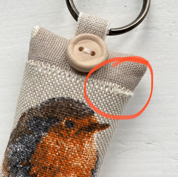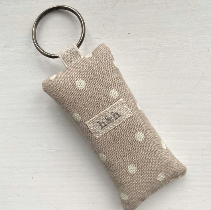 Key ring is made of taupe and white polka dot cotton and features a chirpy robin on a taupe background. Generously filled with locally grown, gloriously scented lavender this fragrant and tactile key ring is finished with a rustic wooden button on one side and a linen 'h&h' label on the other side. The antiqued metal ring is attached with a linen tape loop.