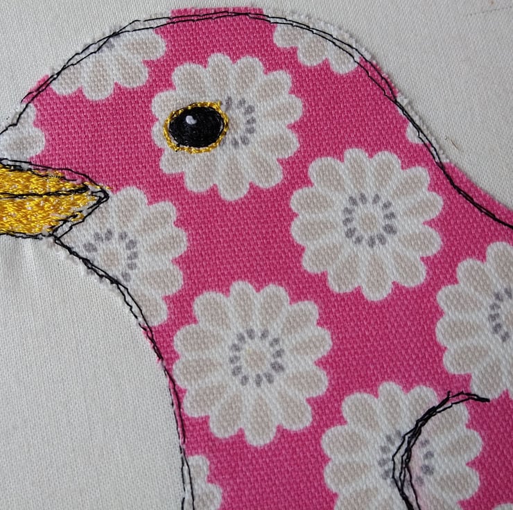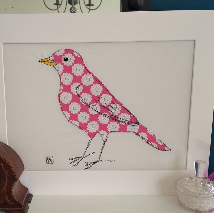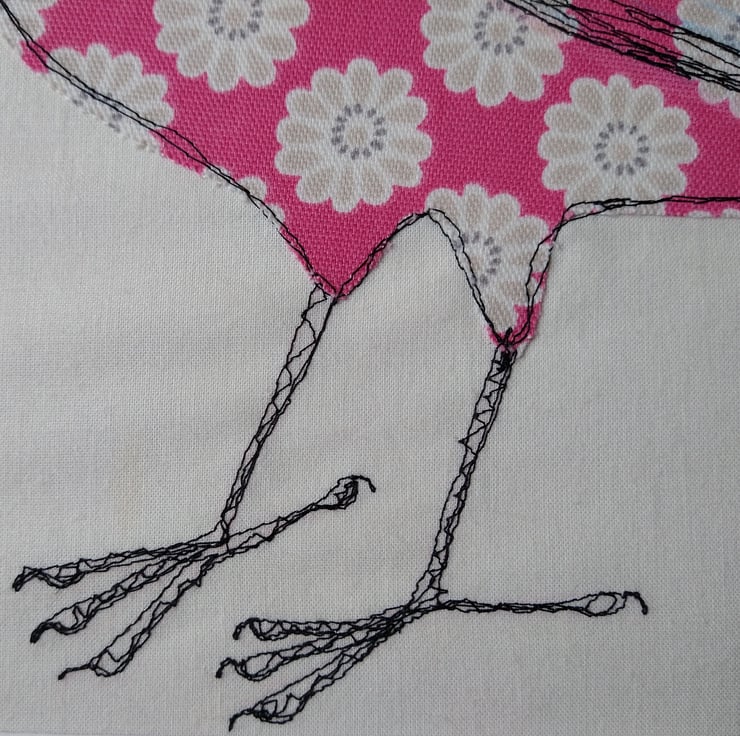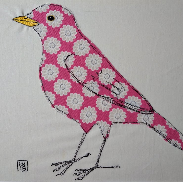 In my work I want to capture the character as well as the look of the birds and animals I portray so whilst I have to admit to not having a seen a bright pink floral blackbird I've definitely seen blackbirds with this kind of character! For this piece I chose this lovely floral print in bright pink for the body and then used bright embroidery thread for the eye and beak to create a bright and chirpy character. I use my sewing machine as a drawing tool, using stitch to define my pieces and capture the spirit of the birds and animals I create.