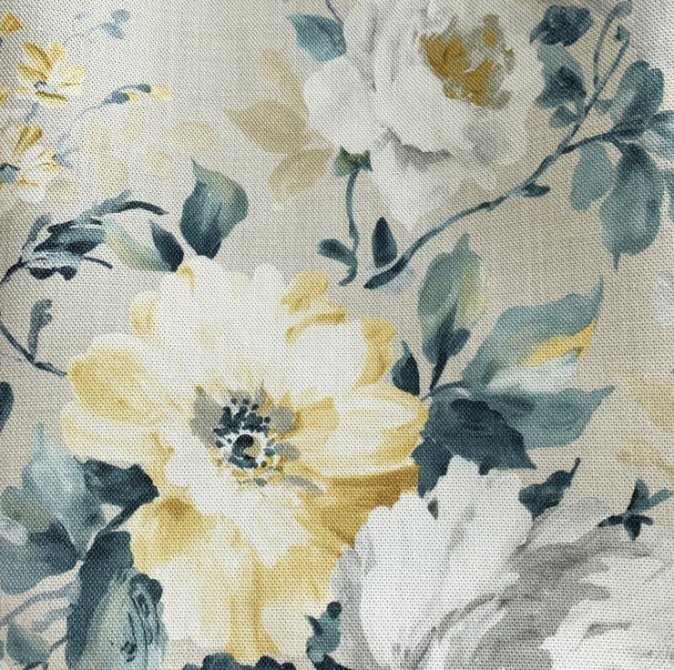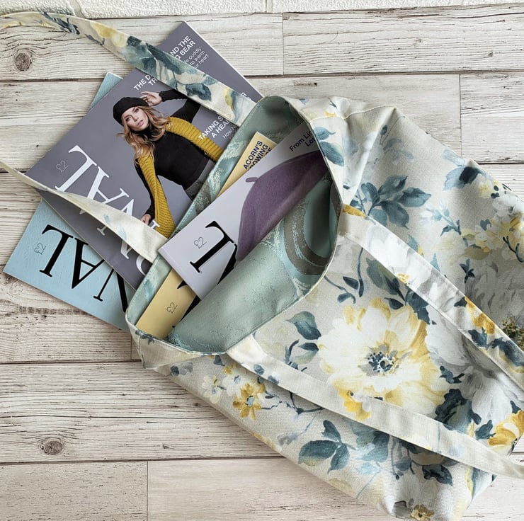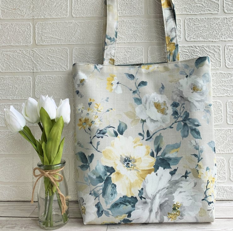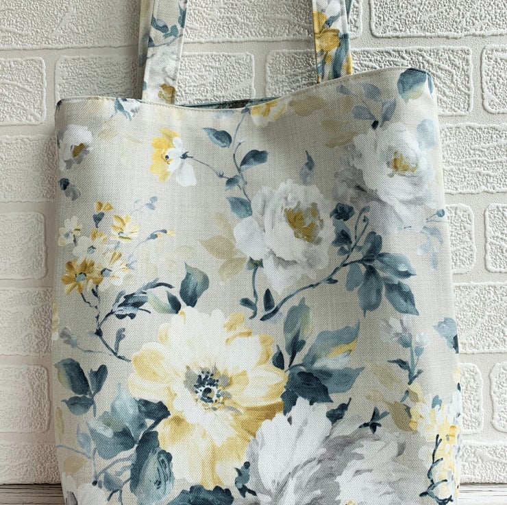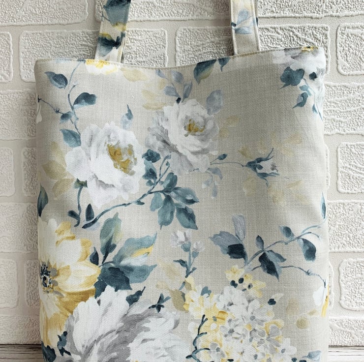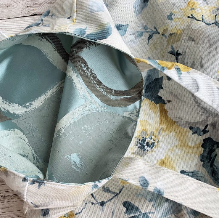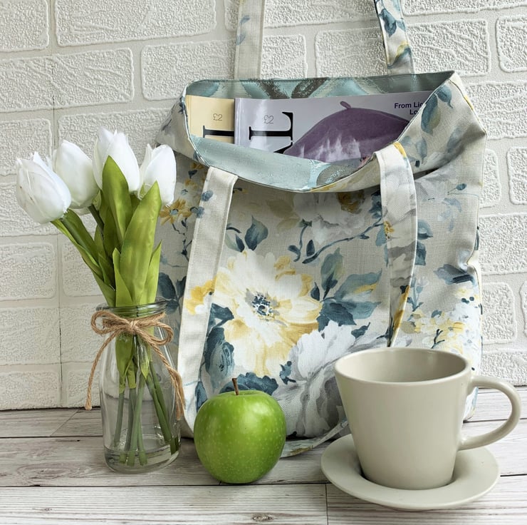 A pretty tote bag in a delightful pastel floral print fabric. The cream fabric has a pattern which features roses and other summer flowers in delicate pastel shades of golden yellow, white, grey and cream, with blue foliage. The bag is lined with an abstract patterned satin-finish fabric in shades of duck-egg blue, silver, grey and cream.