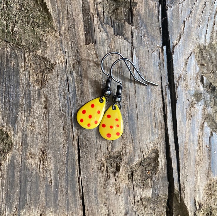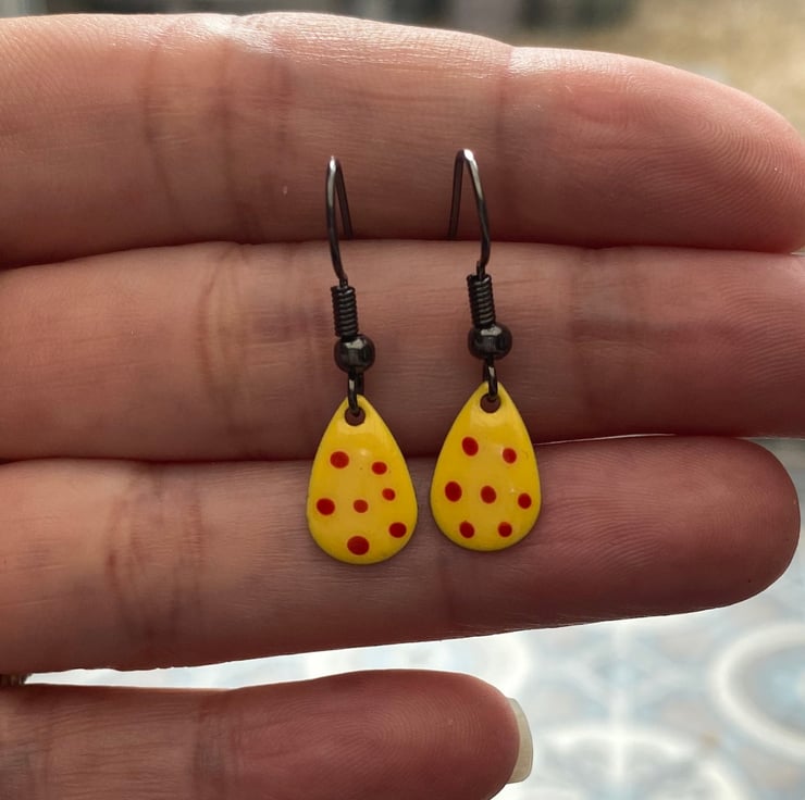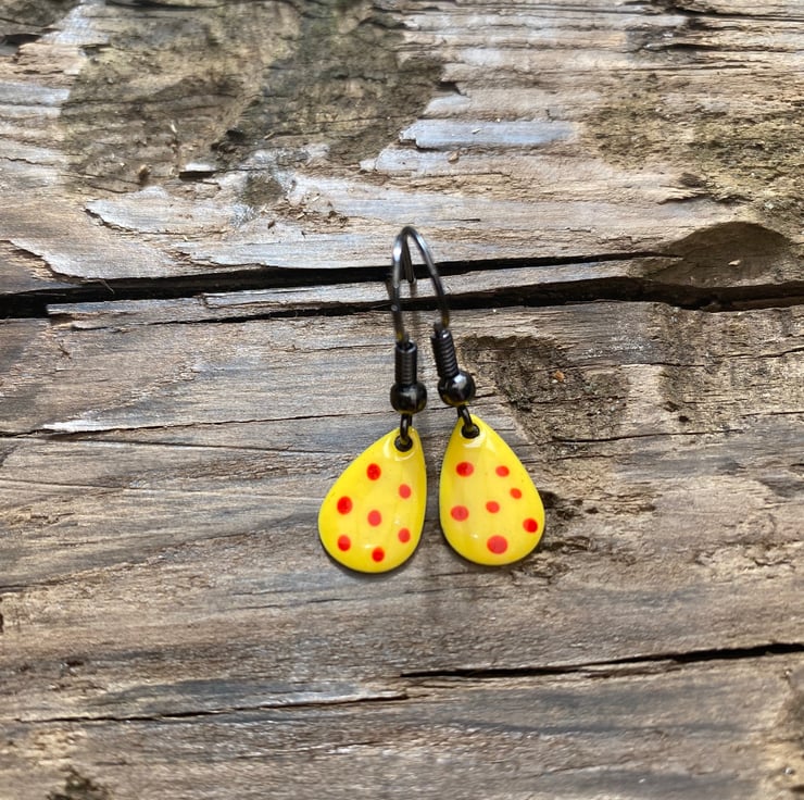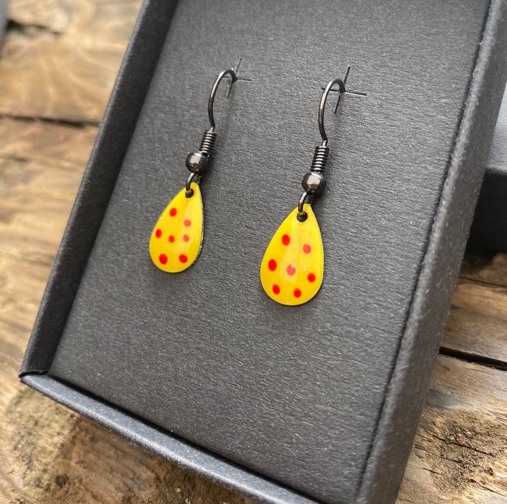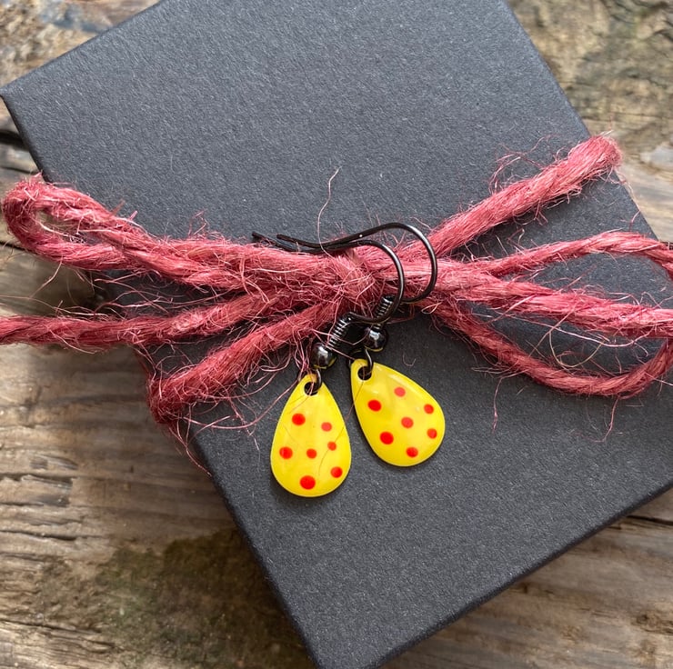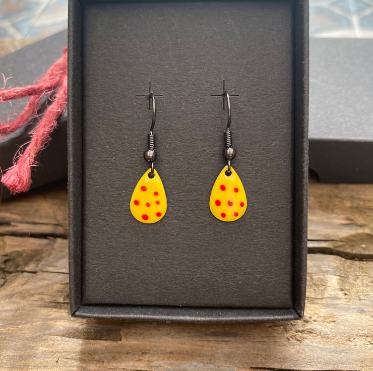 Yellow & Red spot has been made with a base coat of yellow enamel, hand painted with red spots and finished with a transparent coat of enamel,
