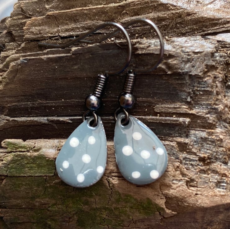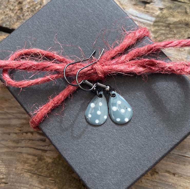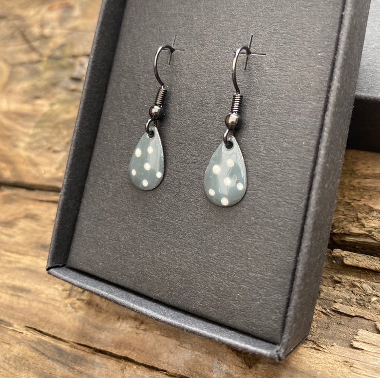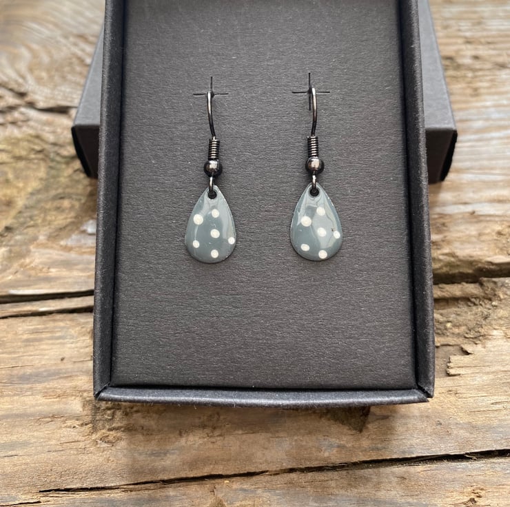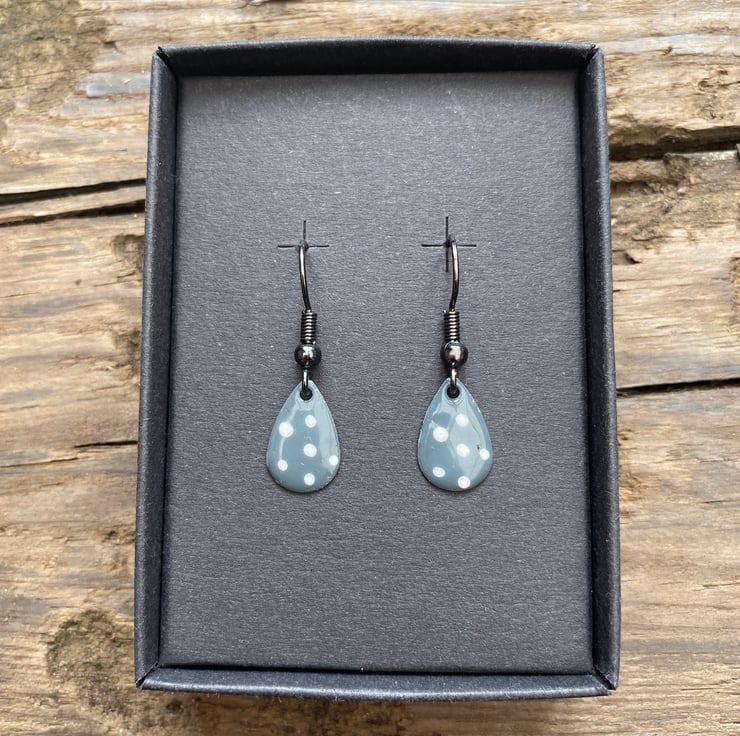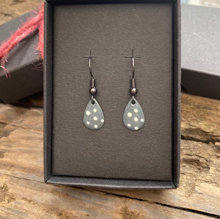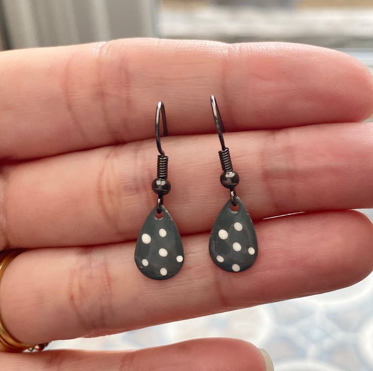 13x8mm silver tone metal charms have been hand enamel in a selection of cold enamel colours. The charms hang from antique black brass earrings, but can be upgrade for an additional cost of £2.50 to Sterling Silver.