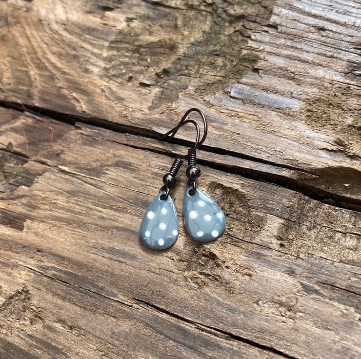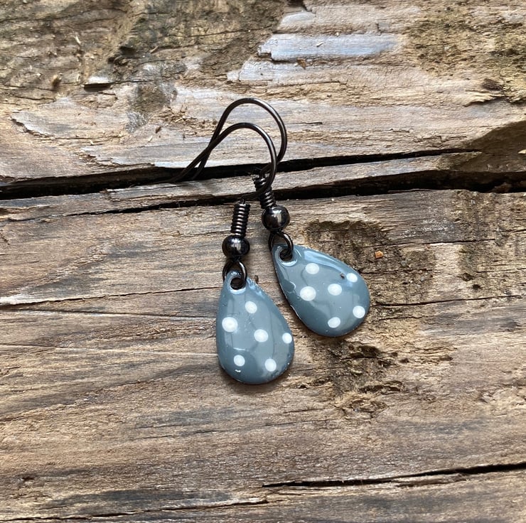 Grey & white spot has been made with a base coat of grey enamel, hand painted with white spots and finished with a transparent coat of enamel,