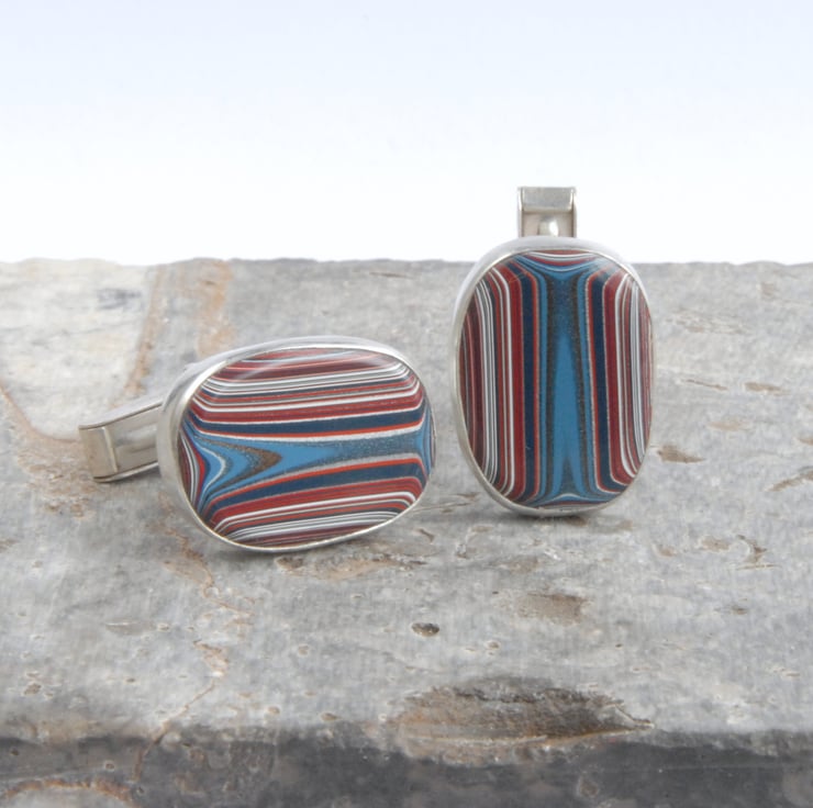 These colourful cufflinks feature oval cabochons of rare Dagenham fordite which is bezel set in sterling silver. They are finished off with sterling silver swivel backs to make them easy to use. The fordite is stripy with a broad flash of mid blue across the middle flanked by red, white, navy and silver bands, they are a not quite matching pair. These unusual cufflinks would make a great gift for any man who loves his cars (especially if he has a soft spot for cortinas or escorts).
