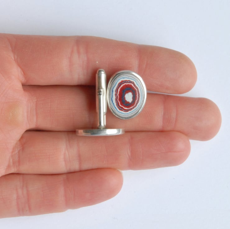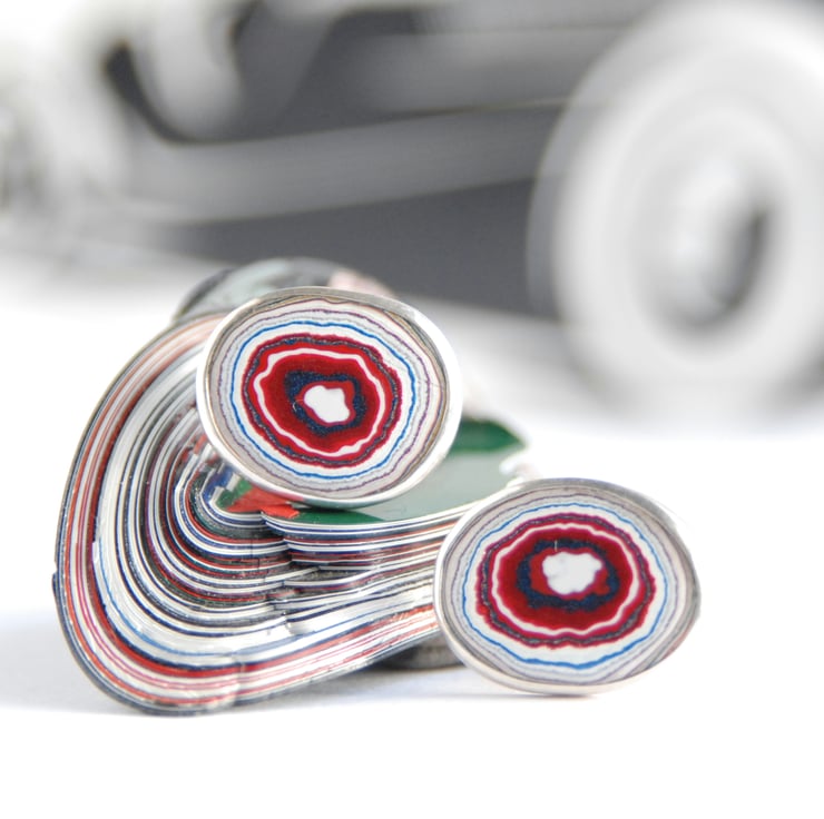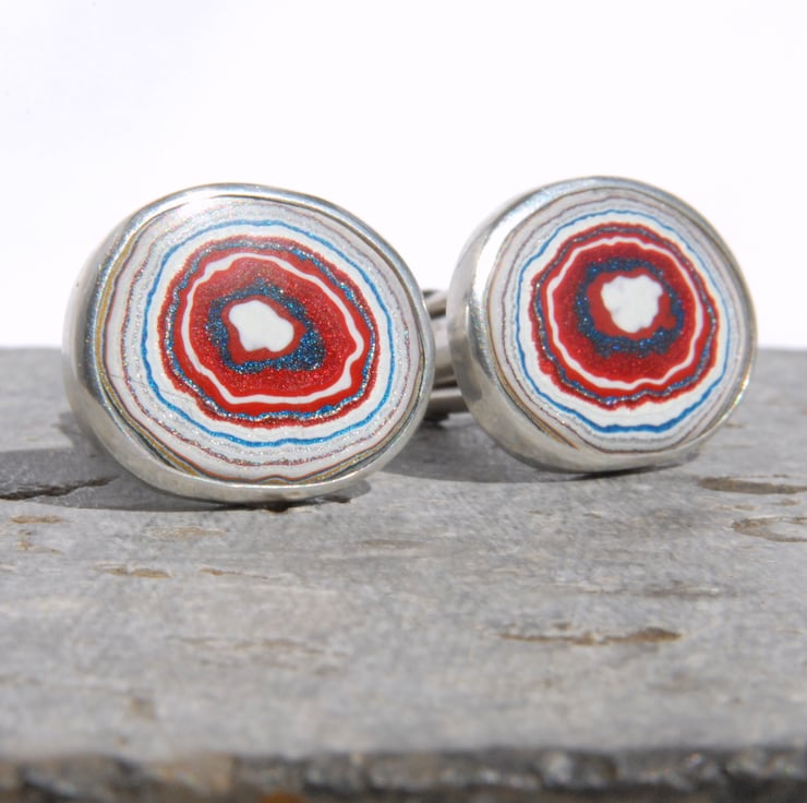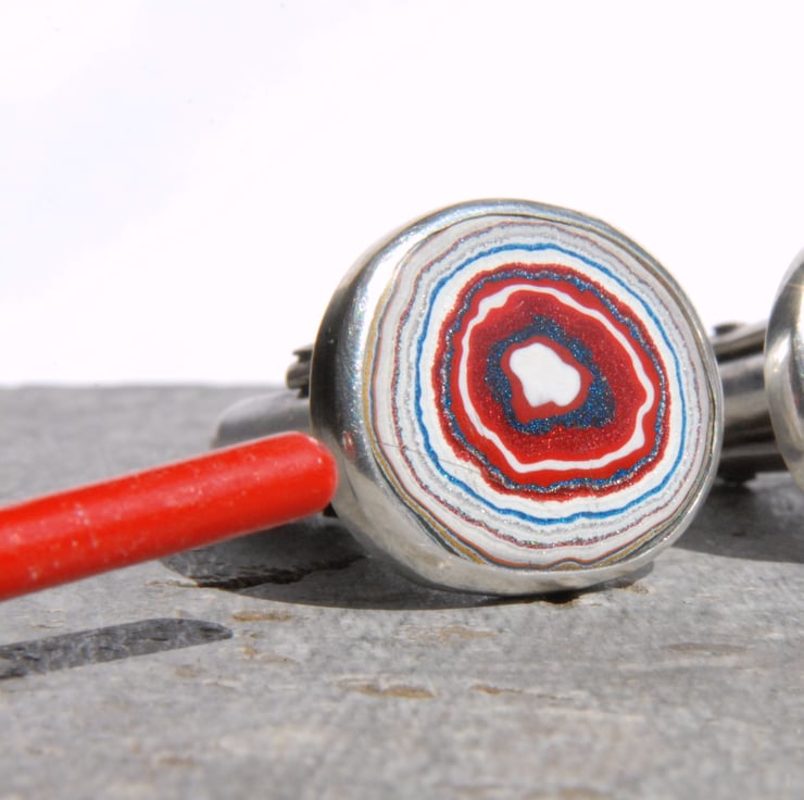 These vibrant cufflinks feature oval cabochons of vintage fordite from the Dodge factory which is bezel set in sterling silver and finished with easy to use sterling silver swivel backs. The fordite has an eye catching pattern of concentric circles in white, red and blue (some are sparkly). These cufflinks are slight seconds, I spotted a crack in one of the cabochons as I was polishing it but the material is too nice to not use (I've tried to point it out with a fine paint brush in a photo). It has been stabilised and the setting protects it so it won't proliferate and the cufflinks will last years.