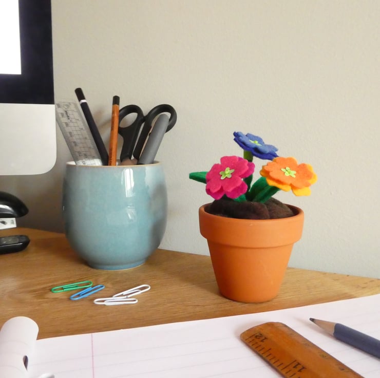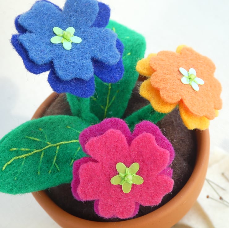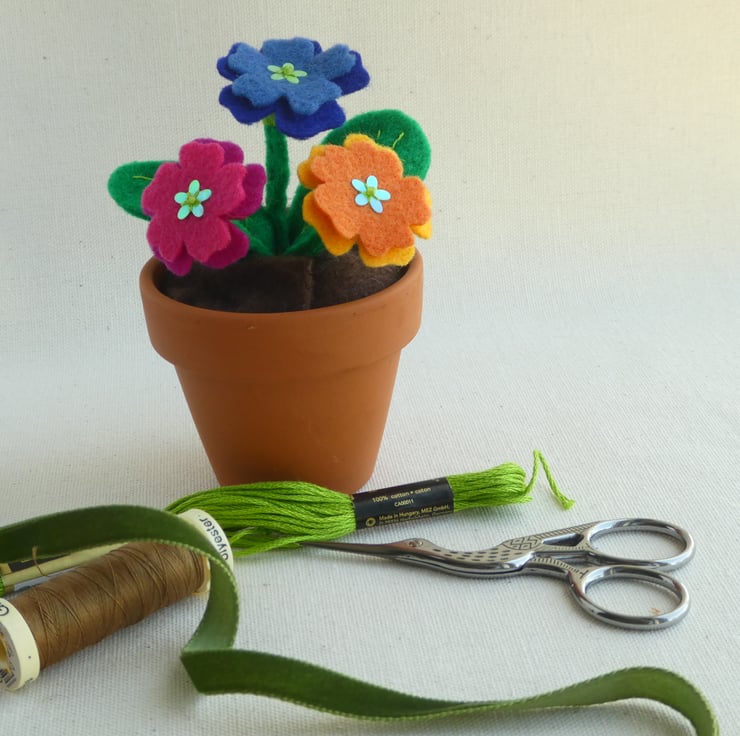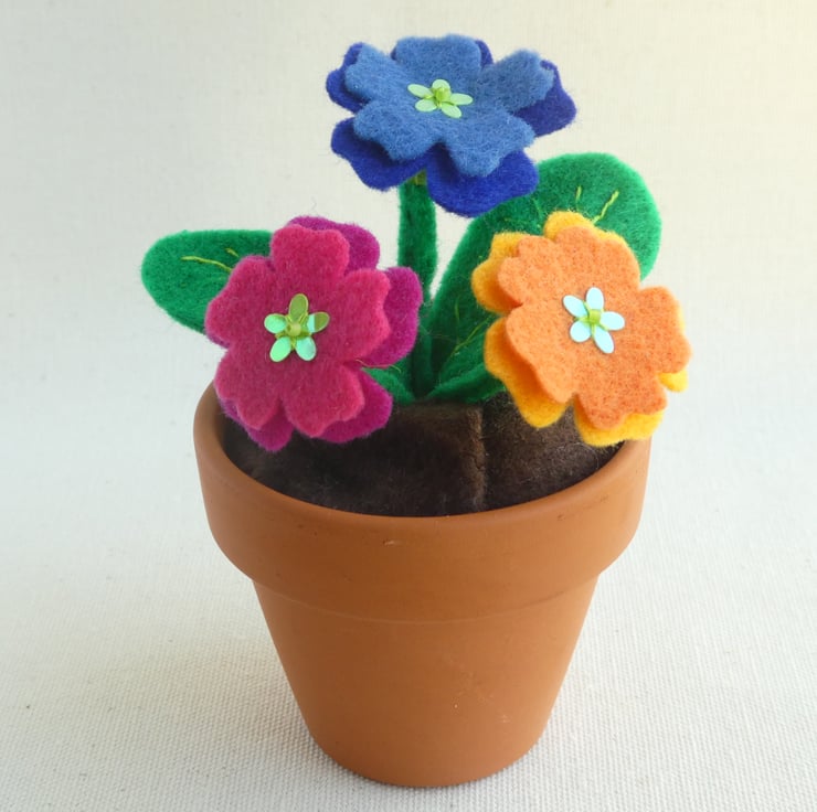 Three felt polyanthus flowers in a little terracotta pot - a low maintenance and drought resistant splash of colour!