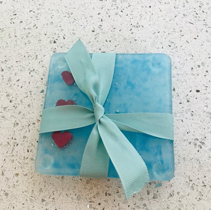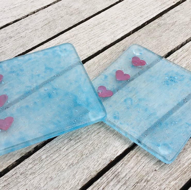 Fused glass coaster set of two . Tiny blue bubbles make these coasters an attractive addition to your home or as a gift. The copper hearts are encased between two layers of glass and a chemical element added to create tiny bubbles within the glass . Presented tied with ribbon . They coasters have bumper feet so as not to damage your furniture .