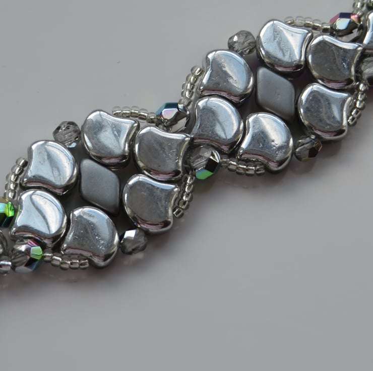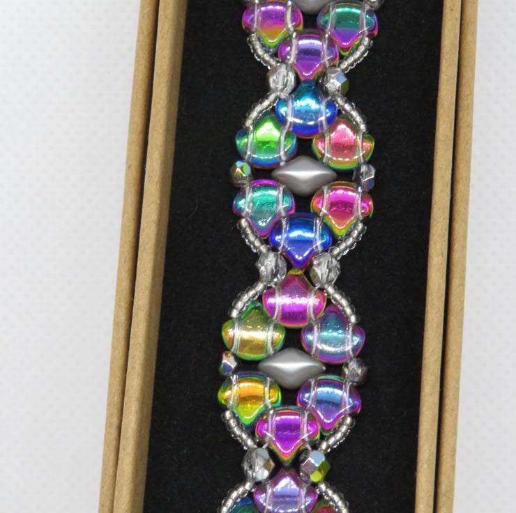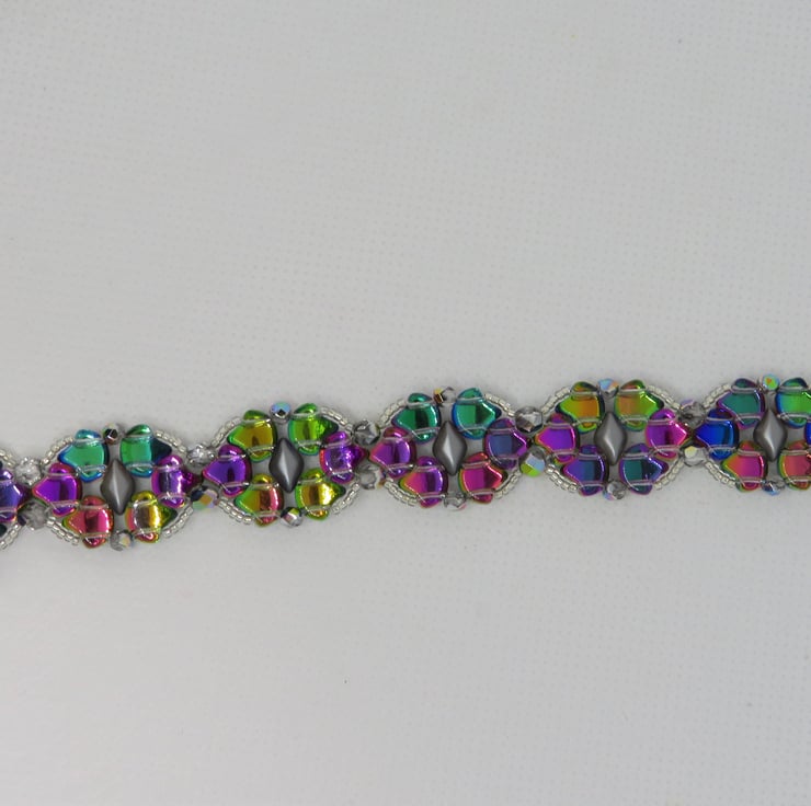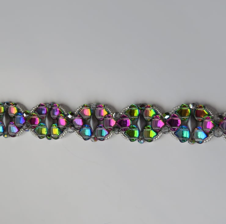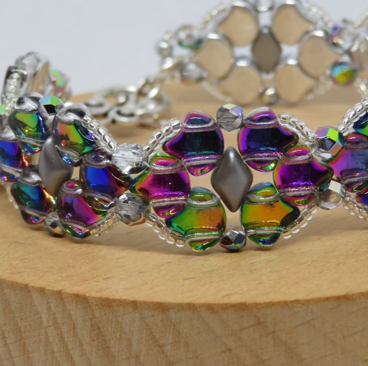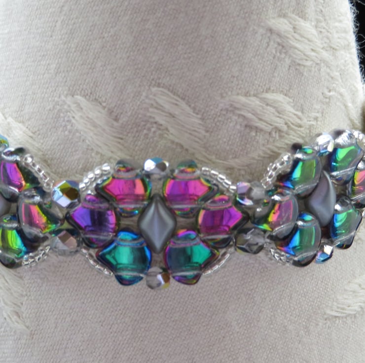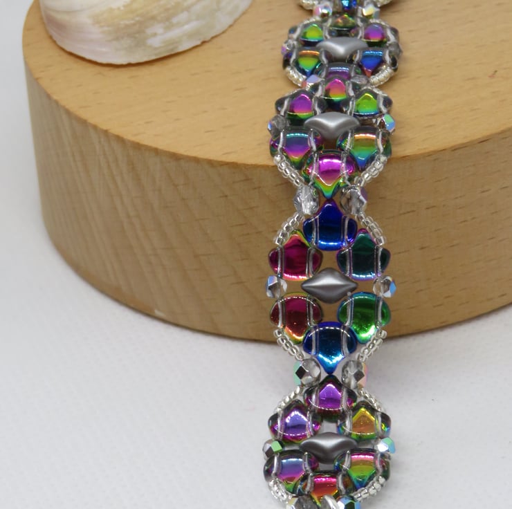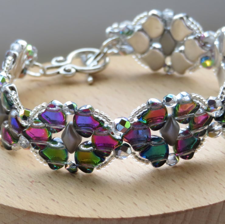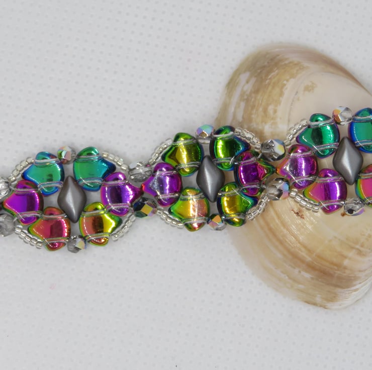 This pretty bracelet is made from a pattern by Magda Dec at Beads Direct. I have chosen glass ginko beads in a shade called 'utopia', which rather resembles the colours of a mermaid's tail, These beads have a silver coloured backing which enhances the colours and really makes them shine beautifully. The beads are stitched together with grey pearl gemduos, firepolish beads for even more shine and clear crystal seed beads. Easily fastened with a Tibetan silver toggle clasp, this bracelet measures 7.5 inches (including the toggle clasp).