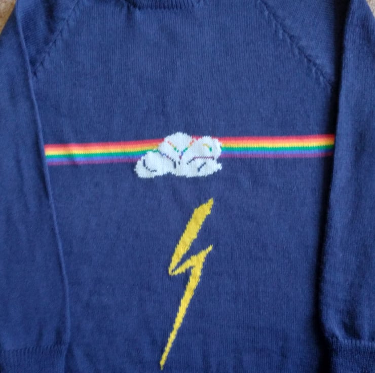 A navy jumper with a bold design on the front depicting a rainbow, cloud and flash of lightning. This can be made to measure in any colour and size. It is in 100 %machine washable merino blend wool.