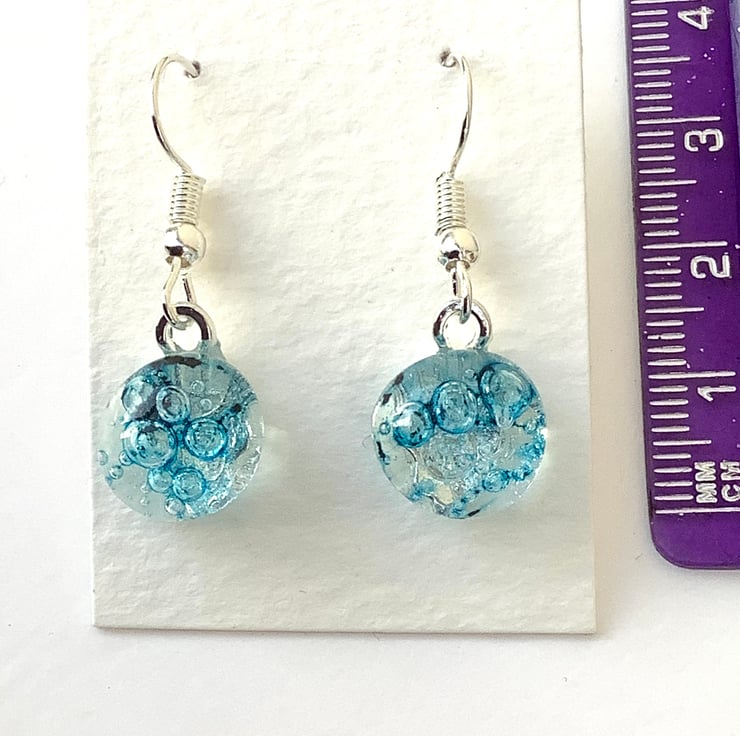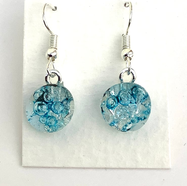 Light blue fused glass bubble earrings. I have put copper oxide between two layers of glass and fused the layers of glass together in a kiln. The copper oxide creates the bubbles. The ear wires are silver plated.