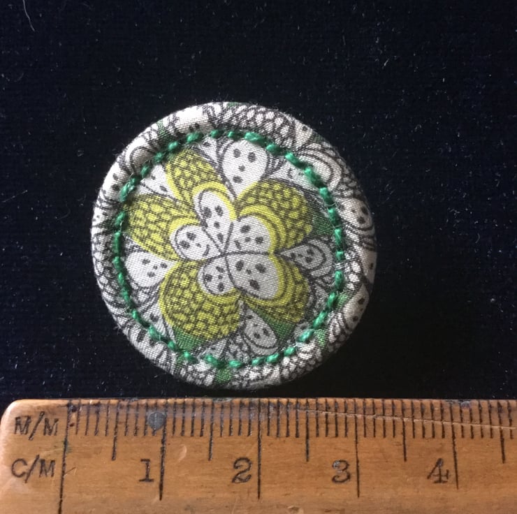 This brooch is made from an early type of traditional Dorset Button known as the Singleton. What makes this brooch special is that the fabric used in its construction is a Liberty print fine cotton lawn in the Grayson Perry design ‘Cranford’ with stitched detail worked in toning green cotton.