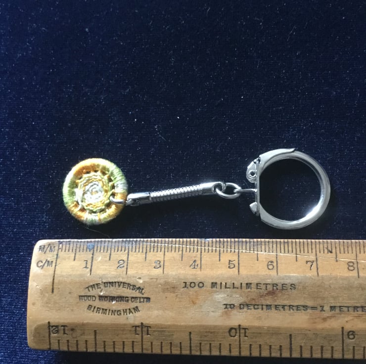 This is an unique, reversible traditional Dorset cross wheel button worked in shades of yellow and green and securely attached to a flexible silver coloured metal link and clip opening key ring.