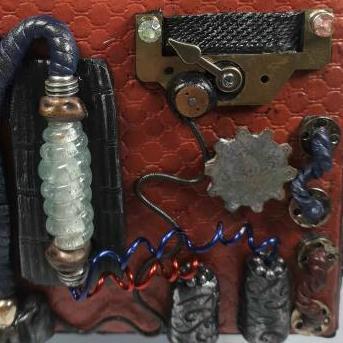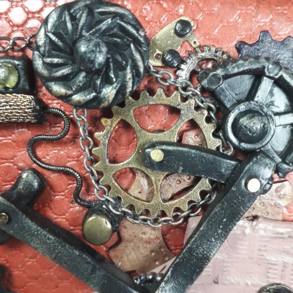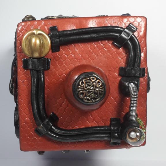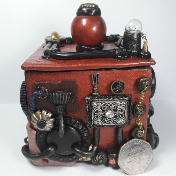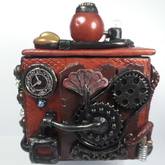 To make this polymer clay steampunk trinket box I have used metallic copper clay for the box base then added decoration in the form of clay pipes & cogs, I have also used wire, chains, bits and pieces from broken jewellery, a mini light bulb and buttons.