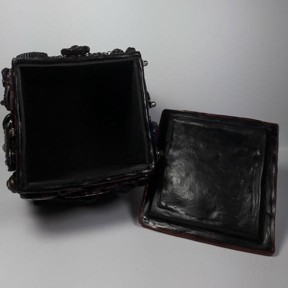 The inside is black and is lined with black foam. I have added touches of gilding wax and a coat of varnish to finish.