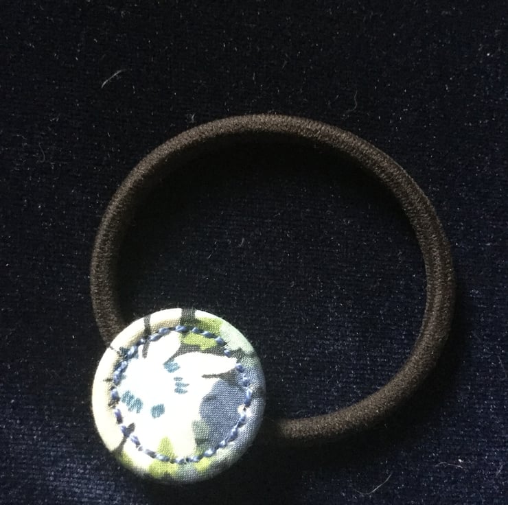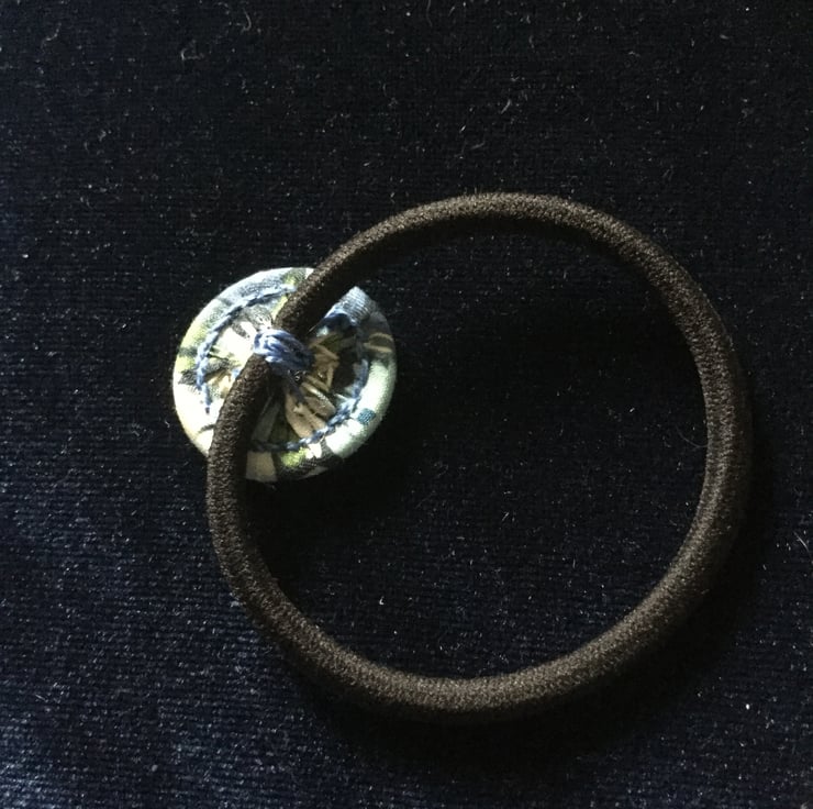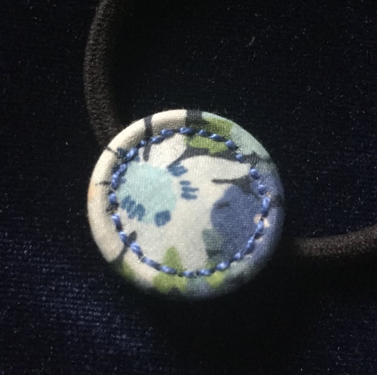 The button is worked in a Liberty Print, in the design ‘Thorpe’, and stitched in blue cotton thread on a 21 mm metal ring and is very securely attached to the black coloured elastic band.