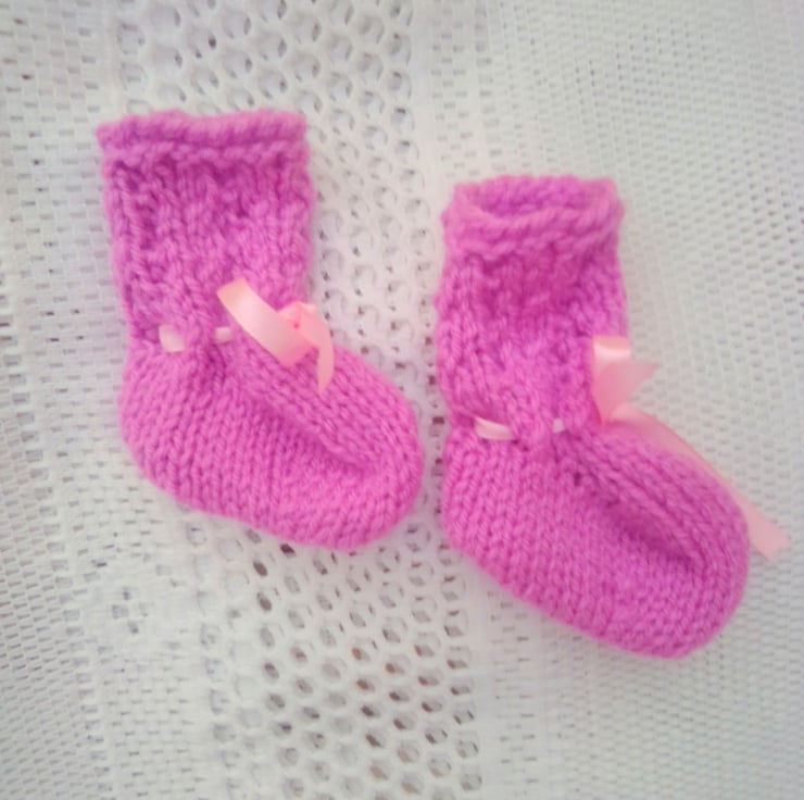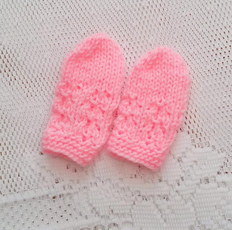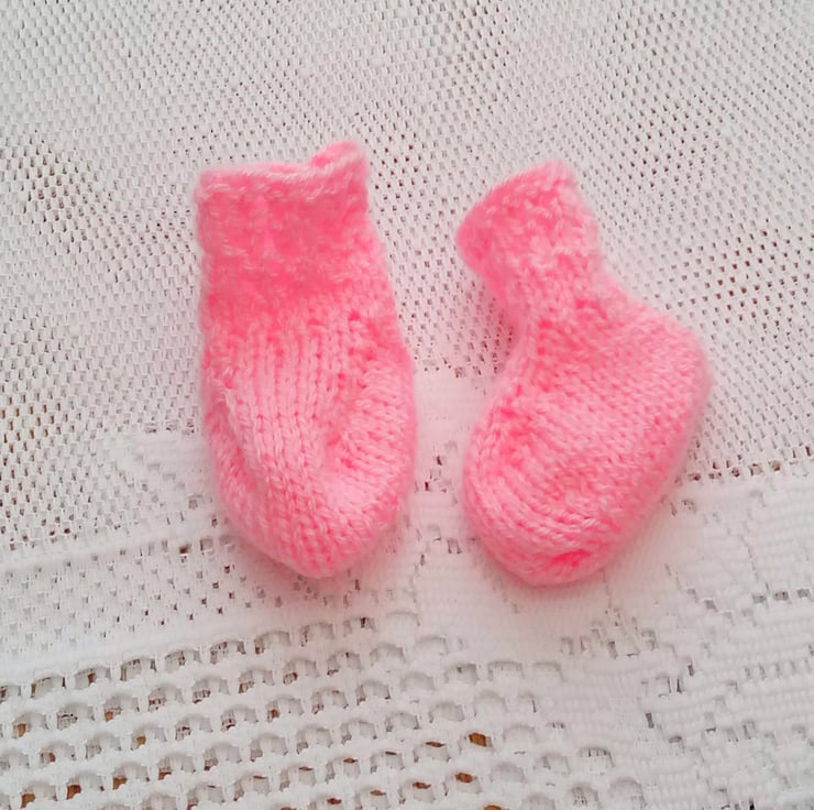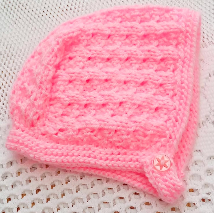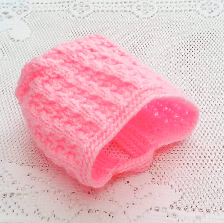 A pretty hat set for baby girl for ages from premature up to 1 year, including a bonnet, a pair of bootees and a pair of mittens. The set is in stock in the dusky rose colour shown and it can be made for you in a size & colour of your choice. The processing time for this to be made and posted out to you is between 1 and 2 weeks.