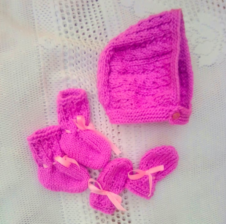 Baby's Bonnet Mittens and Booties Set, Baby Shower Gift, Prem Sizes Available, New Baby Gift, Baby Clothes, Baby Outfit, Knitted Baby Clothes, Hat Set, Custom Make, Prem Baby's Hat Set