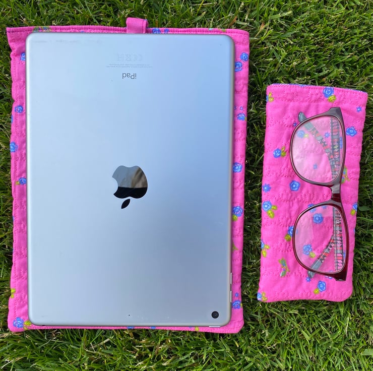 These matching cases have gorgeous purple and green small flowers on a bright pink background. The soft tablet case can be closed with the co-ordinating purple popper fastening. A co-ordinating purple fabric has been used for the lining.