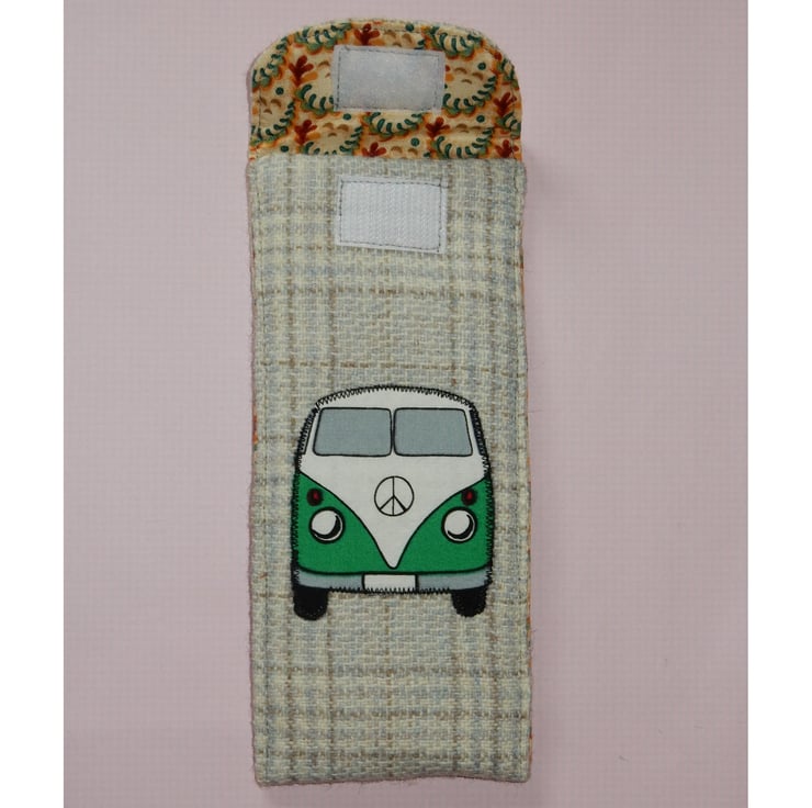 This is a luxury glasses or sunglasses case for campervan lovers. It is made from a lovely soft grey woollen tweed, with an applique campervan. It is lined in a toning cotton print fabric, and has a layer of wadding for added protection for your glasses or sunglasses. The case fastens with Velcro, and measures approximately 3 x 7 inches.