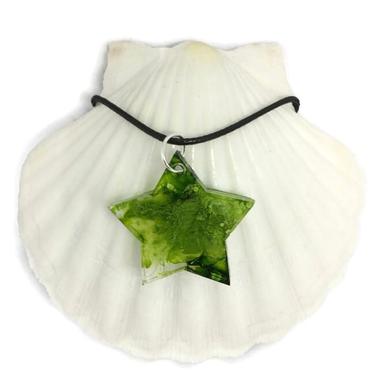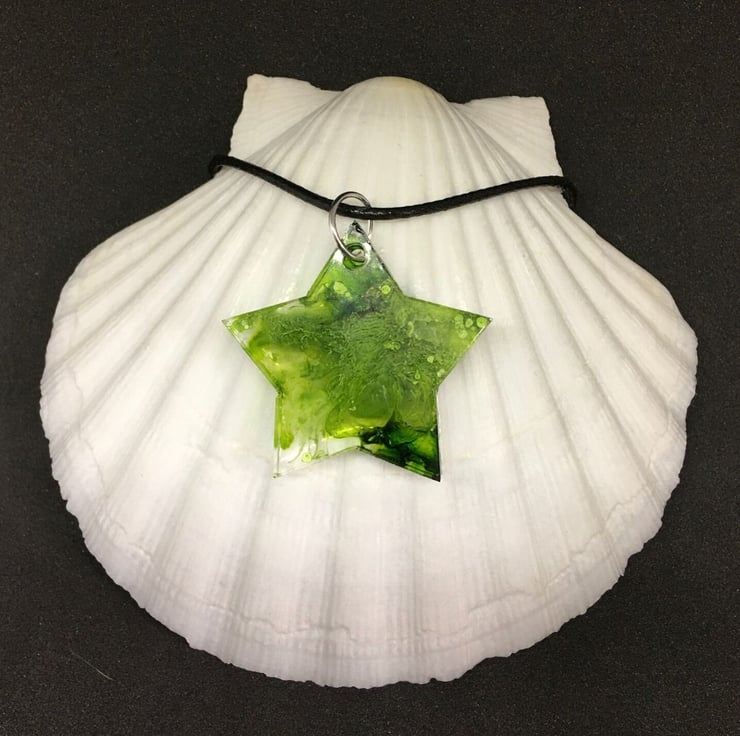 Sale, Green star pendant resin and alcohol ink with a 18 inch black cord necklace.