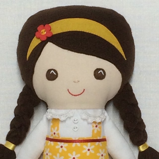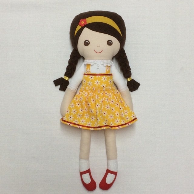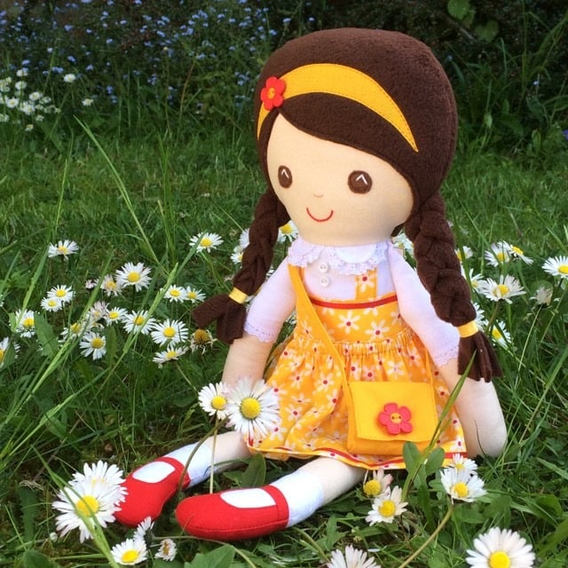 Her brown hair is made from soft fleece and worn in plaits fastened by ribbons. She also wears an Alice band with a red daisy on. She has brown eyes which are made from felt. Her red mouth and tiny nose are securely hand embroidered .