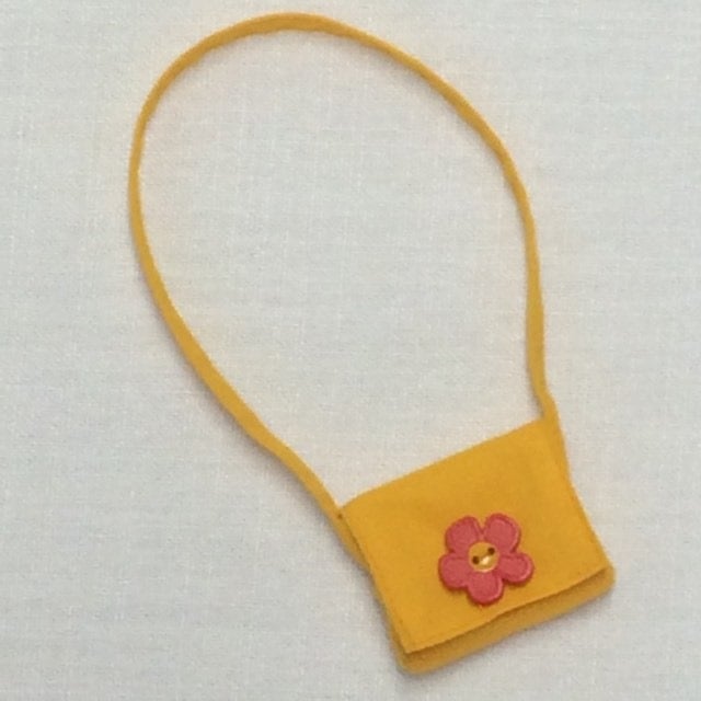 The yellow bag is made from cotton and decorated with a red daisy button. It is fastened with a stud so that treasures can be kept inside.