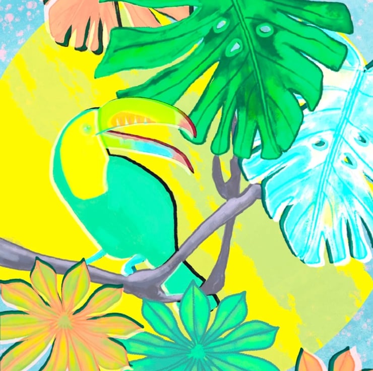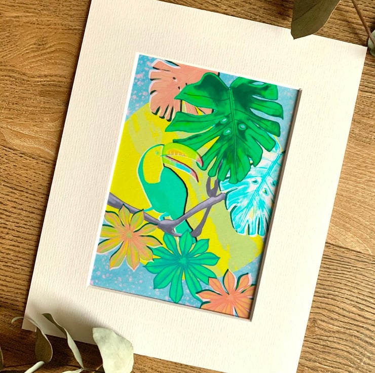 Very brightly coloured tropical botanical and toucan illustration. Printed on to high quality 250gsm white card stock.