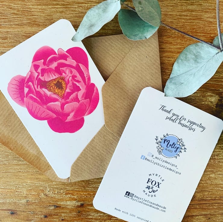 Pack of 8 A6 folded to A7 florist cards with a pink peony flower head design. These cards are made using 100% high quality 300gsm recycled card stock and each is supplied with a recycled kraft envelope with enough room to staple them to your bouquets/gifts.