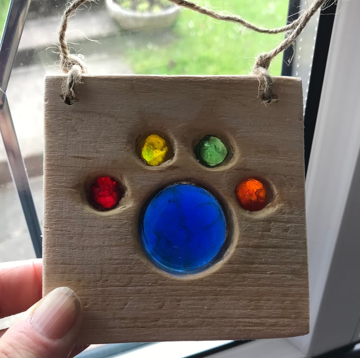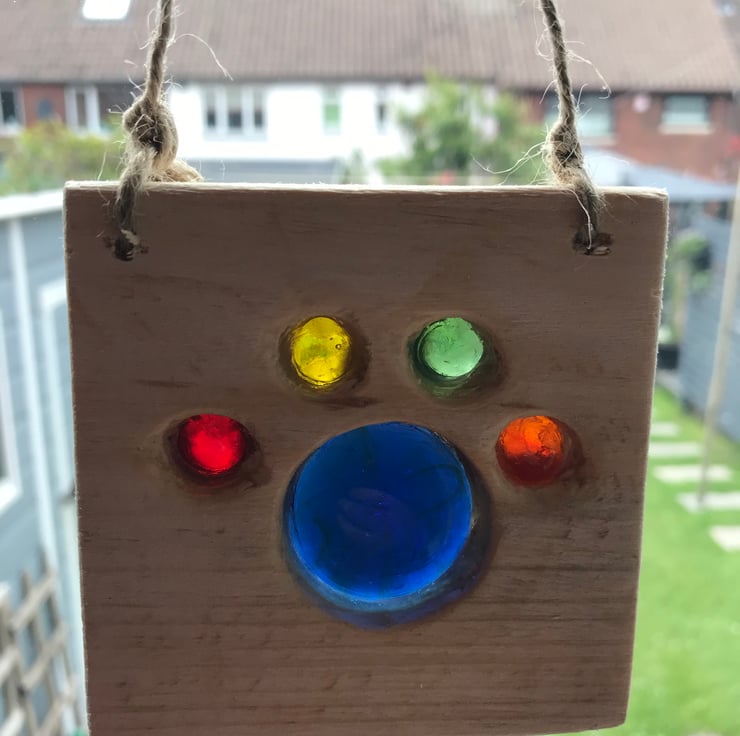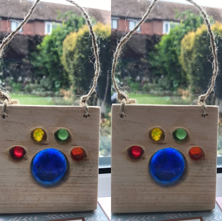 Each one is lovingly handmade, the sun shines through the glass and illuminates the colours. The pieces are drilled and the glass sits in the hole, small holes on the back to allow light through.