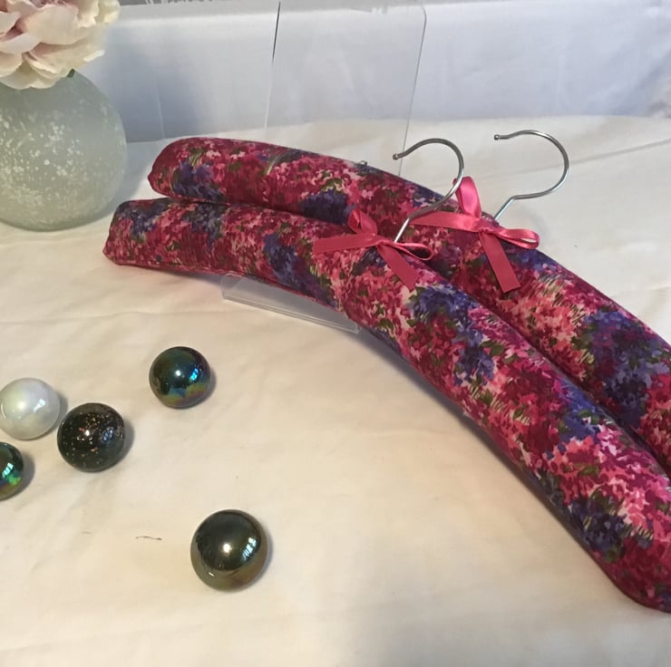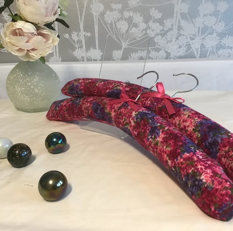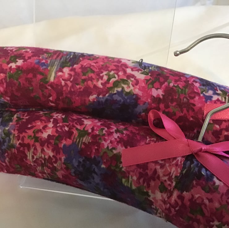 Luxury padded hangers in pretty cotton pink fabric, and finished with toning ribbon. These Hangers are gently curved and will not disfigure the shoulders of your knitwear.