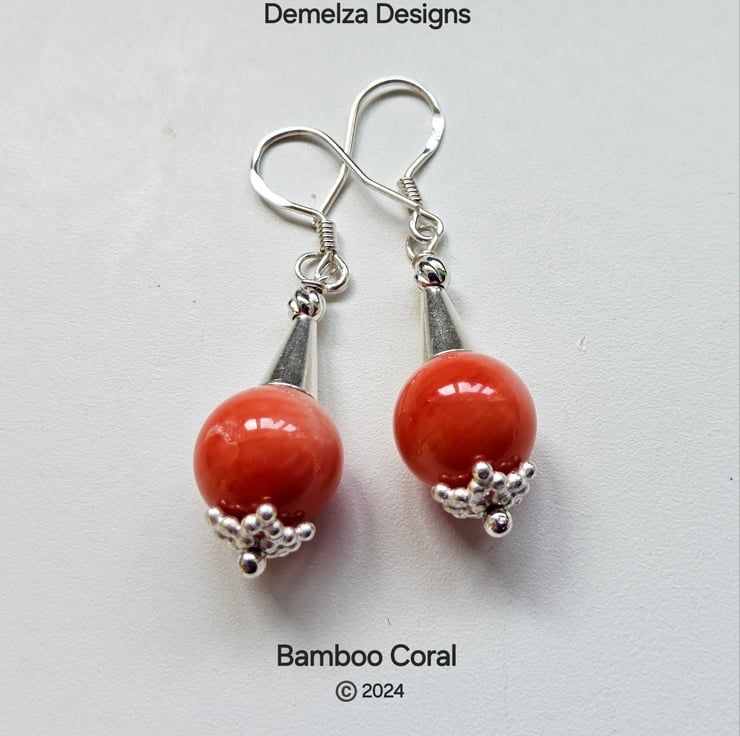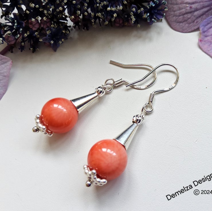 A beautiful pair of genuine eco coral reclaimed earrings designed and hand crafted in Cornwall using all 925 sterling silver components. The coral rounds are 10mm in size. Demelza Designs coral has been ethically gathered from beaches, dyed and cut into perfect rounds by skilled lapidorists and highly polisher. No coral has been taken from living coral reefs.