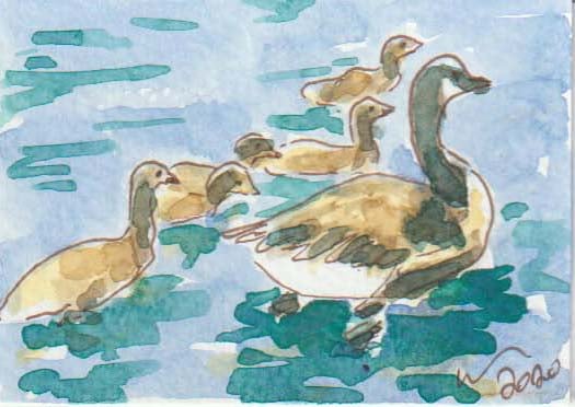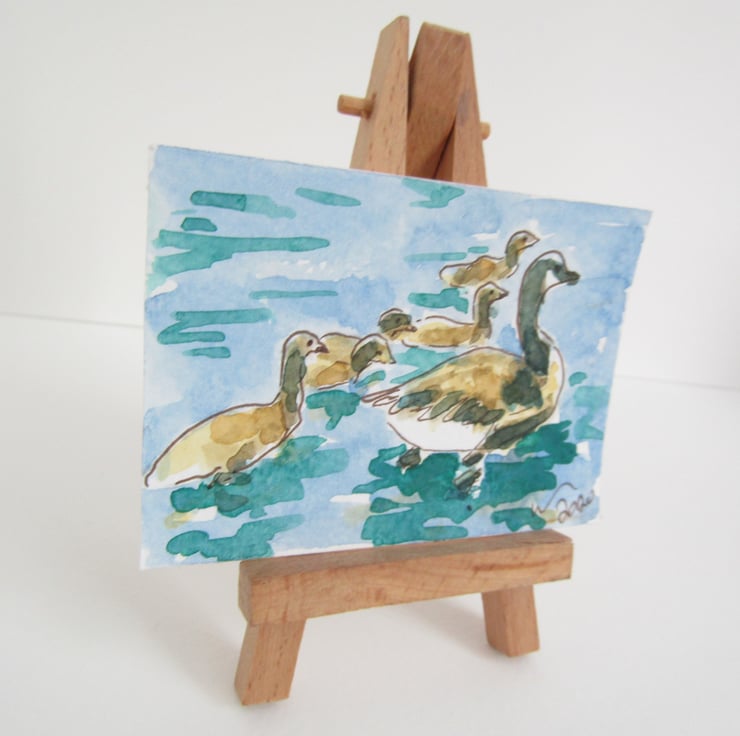 ACEO Art Goslings Swim Original Watercolour & Ink Painting OOAK